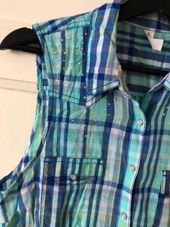 Chemise sans manches KIABI taille 42 Carreaux bleu/vert , strass au niveau des épaules BON ÉTAT #chemisecarreaux #chemiseete #chemise42 #printemps #été Retrouvez tous mes articles en taille XL/42 : #IxFeelxInsaneXL42