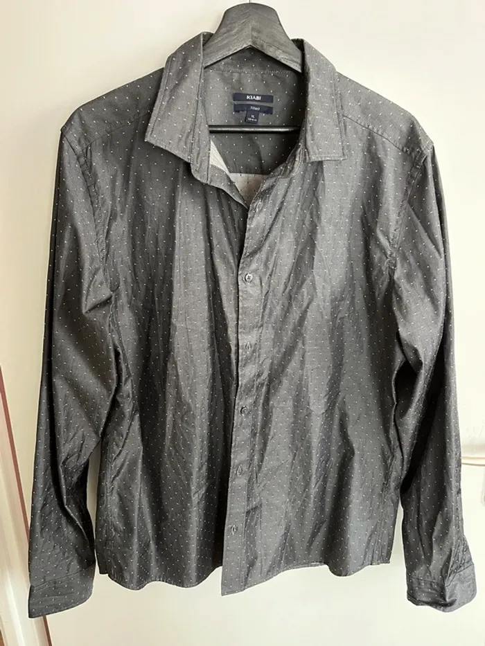 chemise gris anthracite KIABI taille XL pois blancs brodés, matière légèrement brillante, 61% polyester et 3% coton, coupe fitted TRÈS BON ÉTAT #chemisehomme #chemisehabillée #chemisexl Retrouvez tous mes articles homme : #IxFeelxInsaneHomme