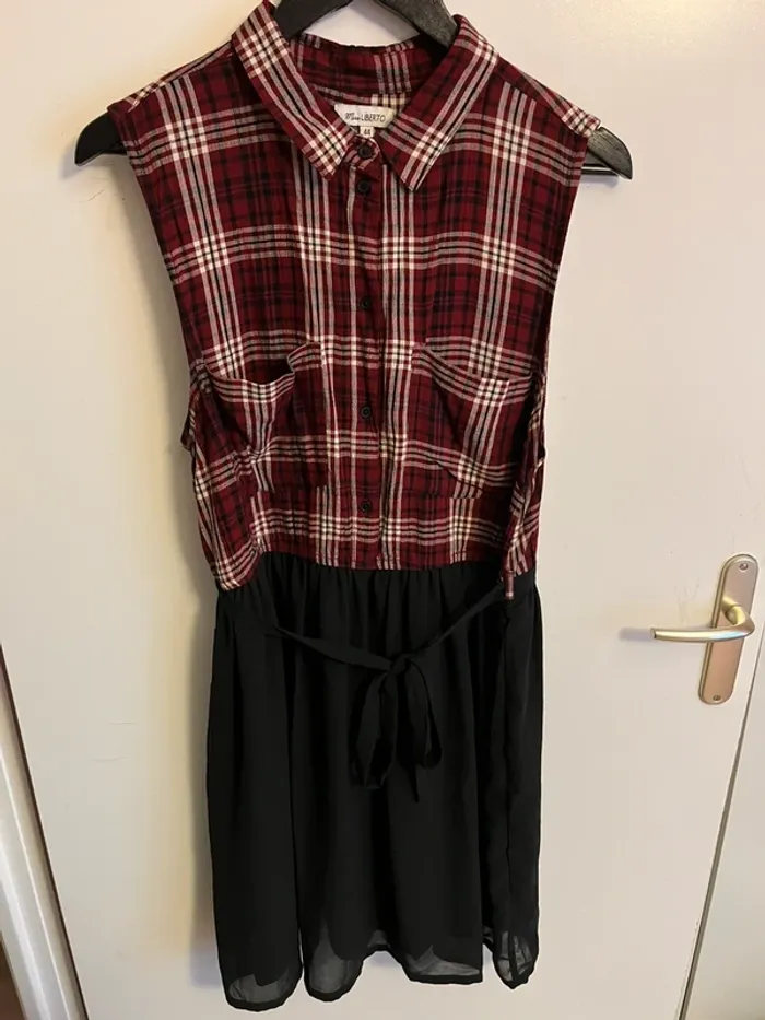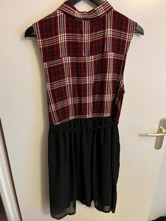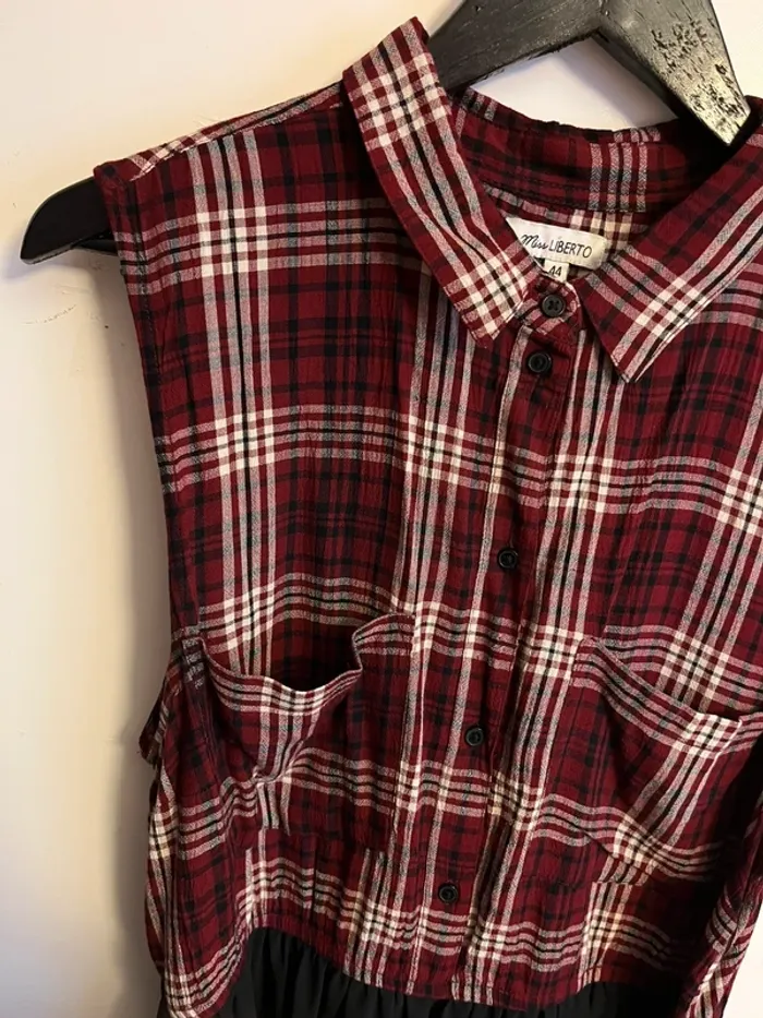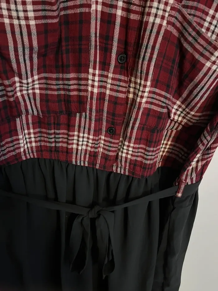 Haut effet chemise en viscose à carreaux rouge/blanc/noir, bas en voile noir en polyester, ceinture en voile, deux poches sur la poitrine