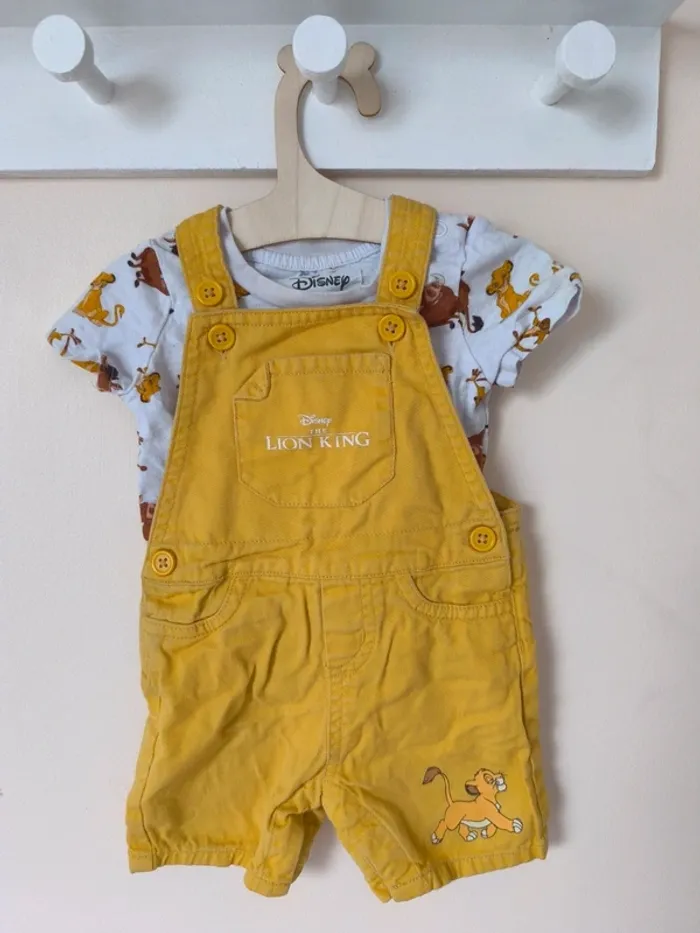 Ensemble salopette short et t-shirt, motif Roi Lion. Taille 6 mois, pour l'été.