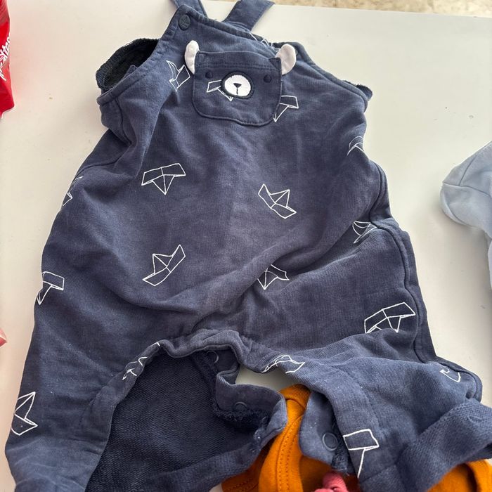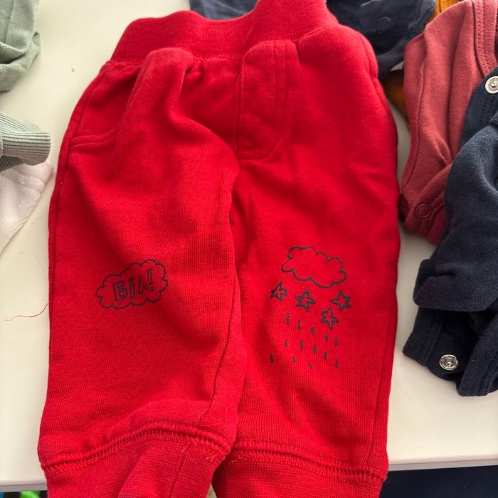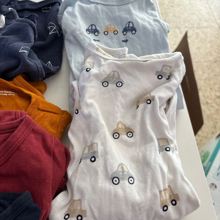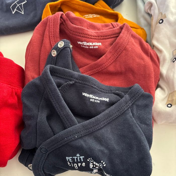 Lot de vêtement vert baudet - 2 bodys manche longue bordeaux et moutarde avec pression sur le devant taille 3 mois 60cm - 1 body bleu marine manche longue avec pression sur le devant taille 1 mois 50cm - 2 pyjama manche longue avec pression sur le dos un blanc et un bleu clair - 1 pantalon rouge 3 mois 60cm - 1 salopette bleu épaisse mais sans manche longue avec pression à l’entrejambe 3 mois 60cm