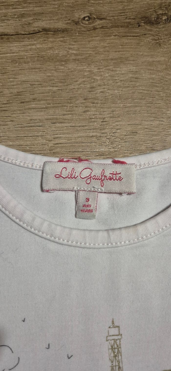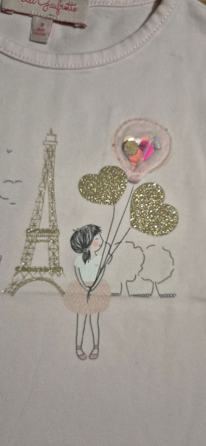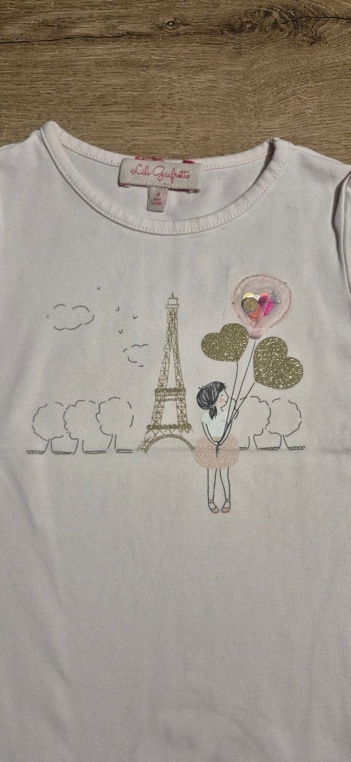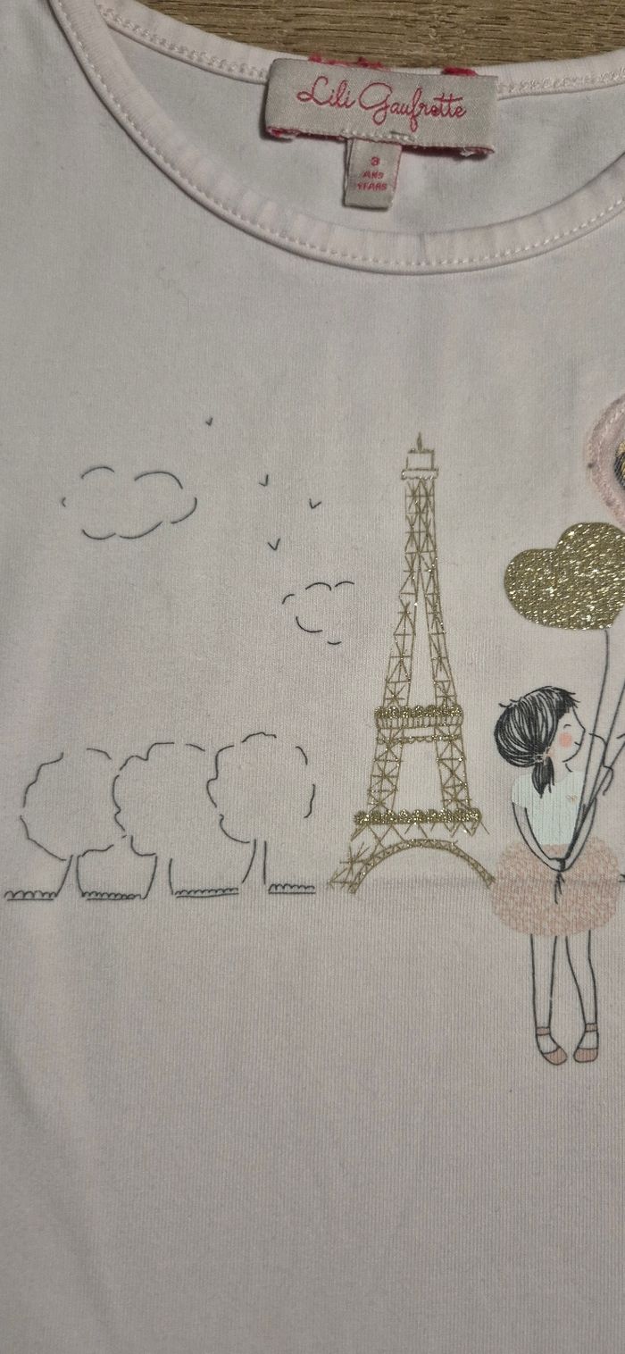 T-shirt à manches courtes à motifs tour eiffel dorée et petite fille qui tient des ballons dorés Lili Gaufrette taille 3 ans mais convient à du 2-3 ans Très bon état
