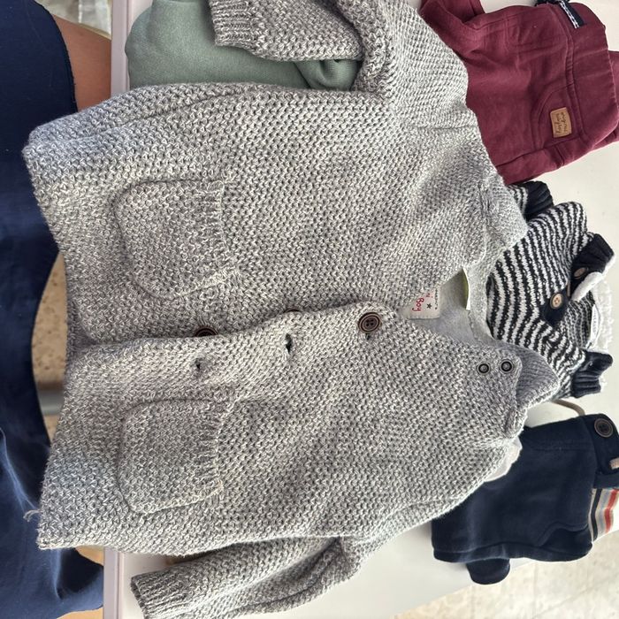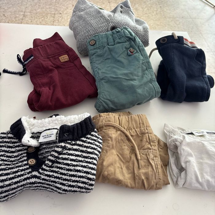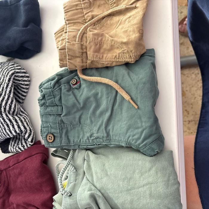 Lot de vêtement tape à l’œil - 2 pantalon vert taille 18 mois 80 cm - 1 short beige taille 18 mois 80 cm - 1 pantalon bordeaux taille 23cm 86cm - 1 veste grise en laine avec bouton taille 12 mois 74cm - un pantalon bleu taille 12 mois 74cm - un pull blanc et bleu en laine taille 3 mois 59 cm - un tee shirt manche longue 9 mois 71 cm