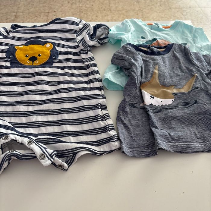 Une salopette taille 6 mois bleu et blanche avec pression entrejambe 2 tee shirt taille un mois manche courte