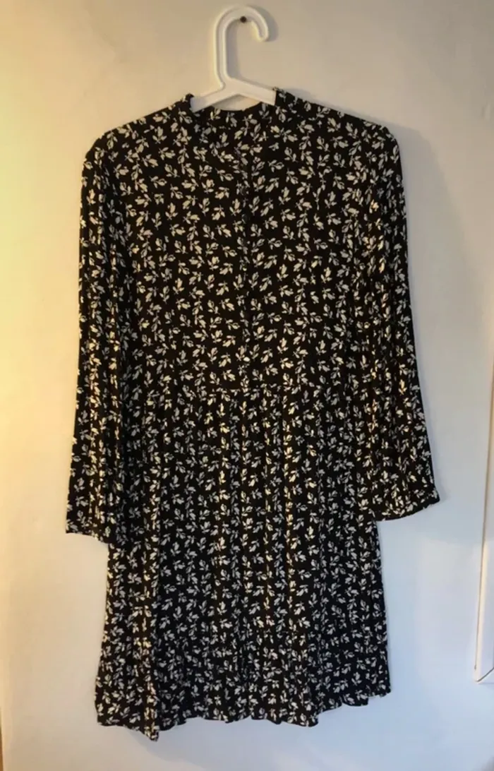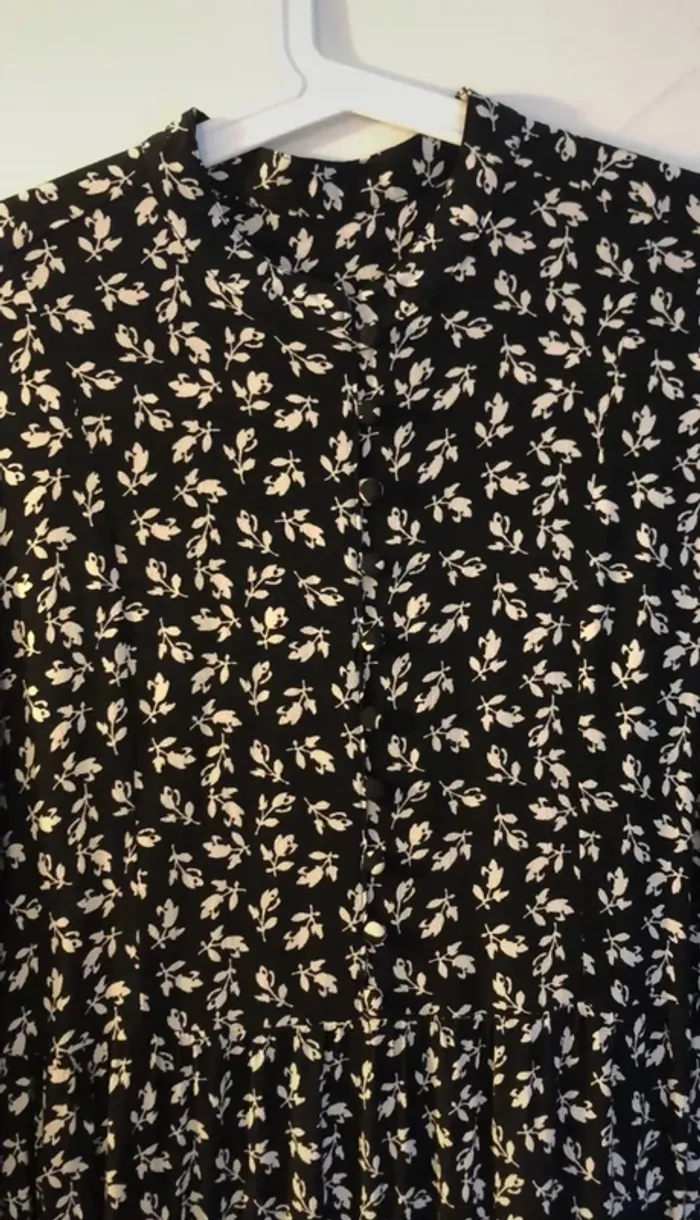 Robe longueur 88cm, noire avec fleurs beiges. Petits boutons ton sur ton devant. Manches longues. Idéale pour le printemps
