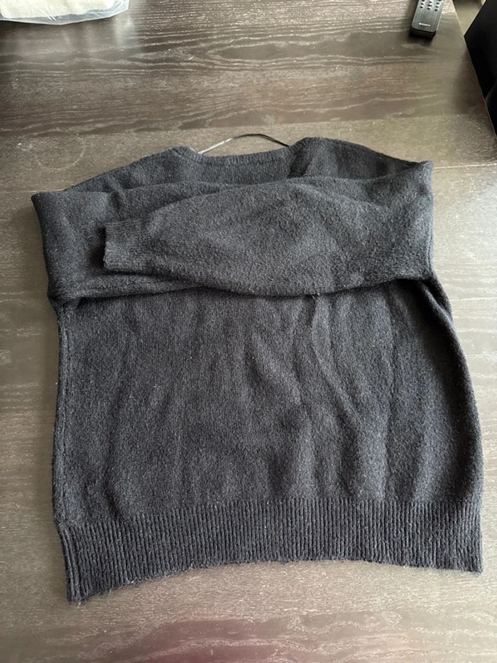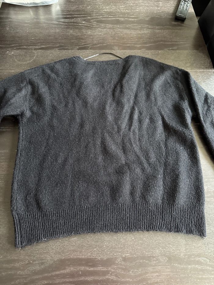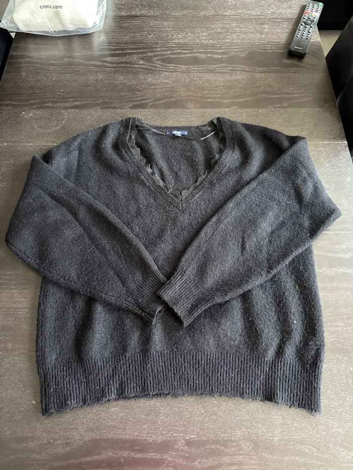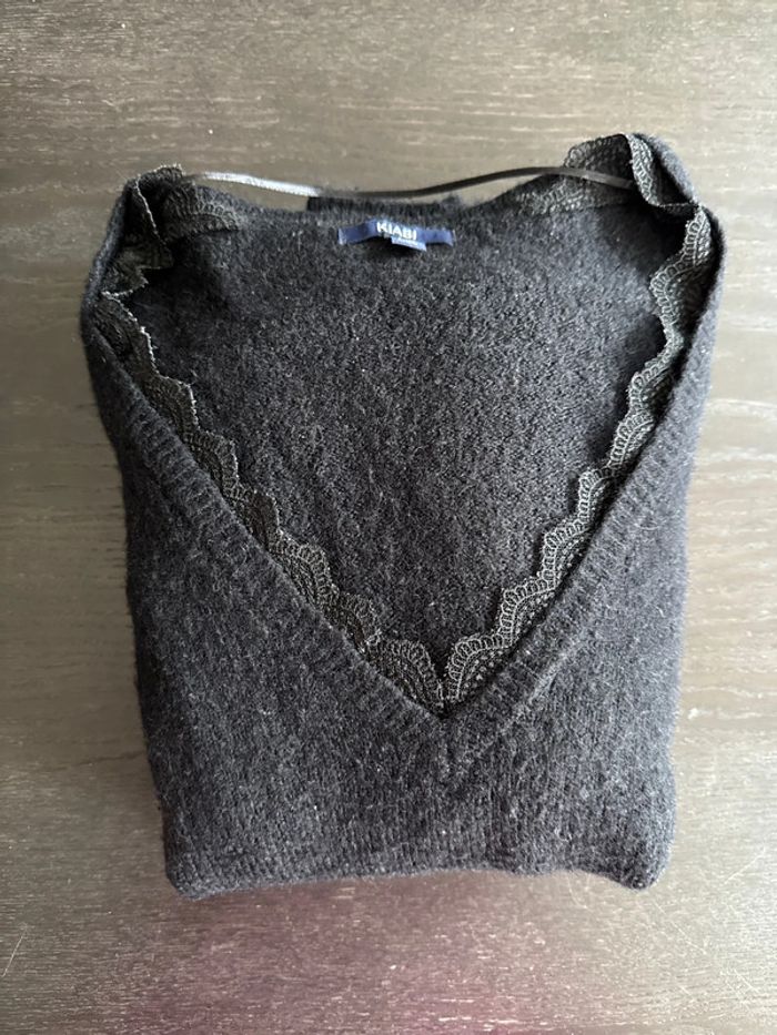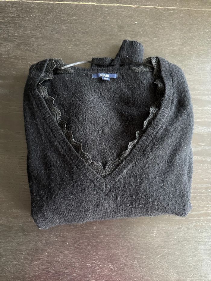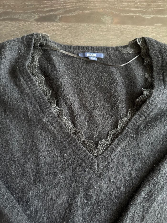 Pull noir à col V avec petite dentelle , taille L (42/44), très bon état, peu légèrement pelucher . Kiabi