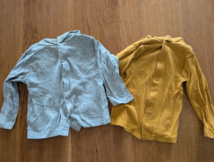 2 sous pull Verbaudet 9 mois jaune et gris, fermeture par pression dans le dos.