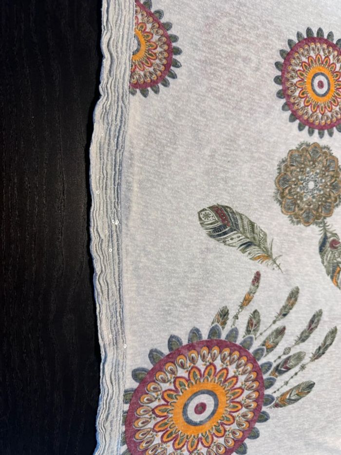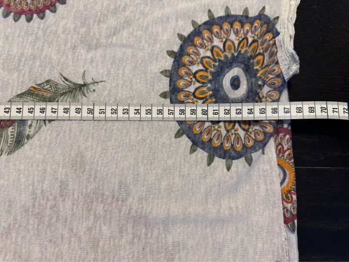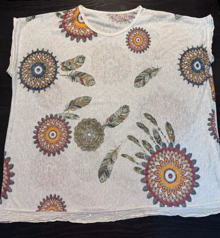 Tunique femme taille unique mais peu aller jusqu’au 50/52. Mesure aisselles sous aisselles 67cm, micro taches rouges au milieu acheter comme ça . Effet broderie sur le bas et les manches