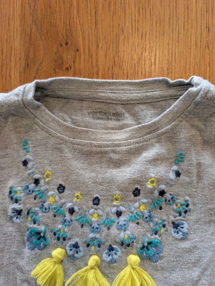 Tee-shirt manches longues fille gris avec broderies. Marque Verbaudet.