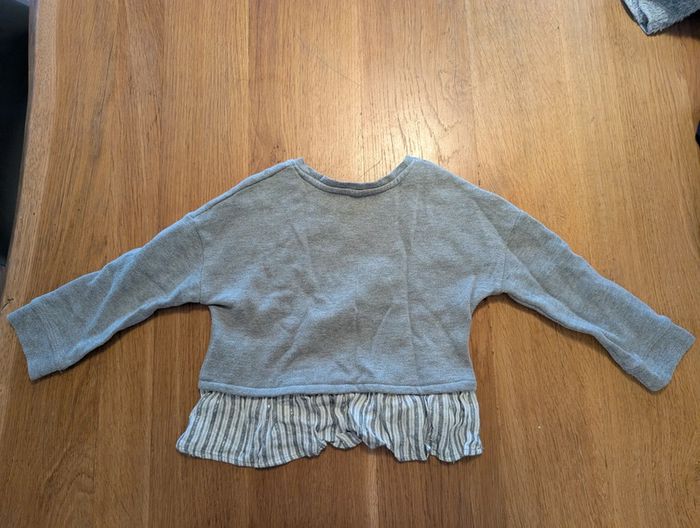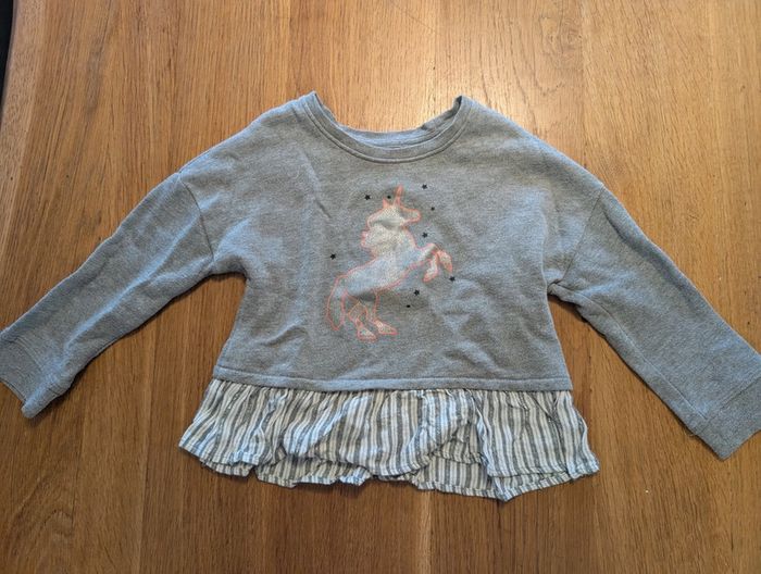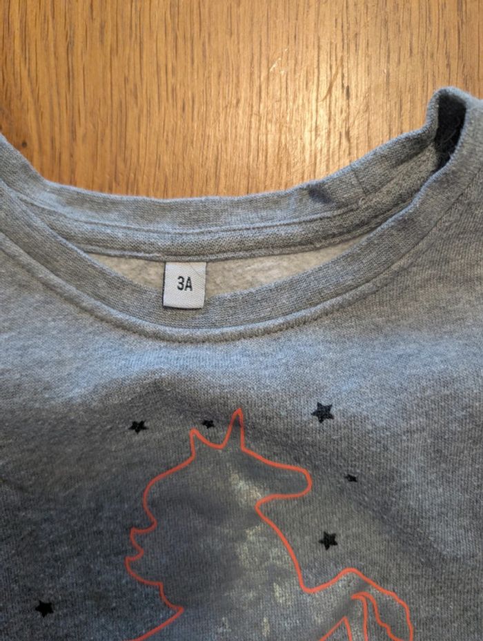 Pull licorne à volant fille, taille 3 ans, gris, en très bon état.
