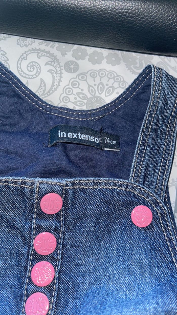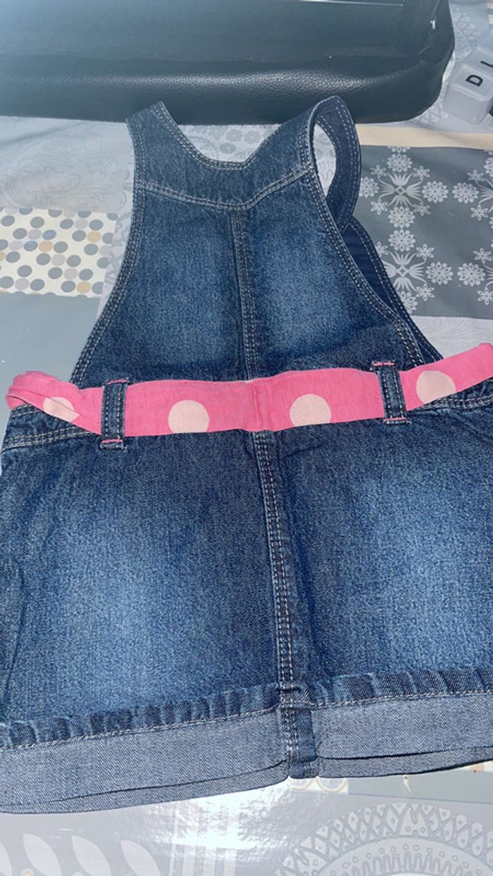 robe en jean salopette avec ceinture rose à petit pois blanc , très bon état , in extenso taille 74 cm