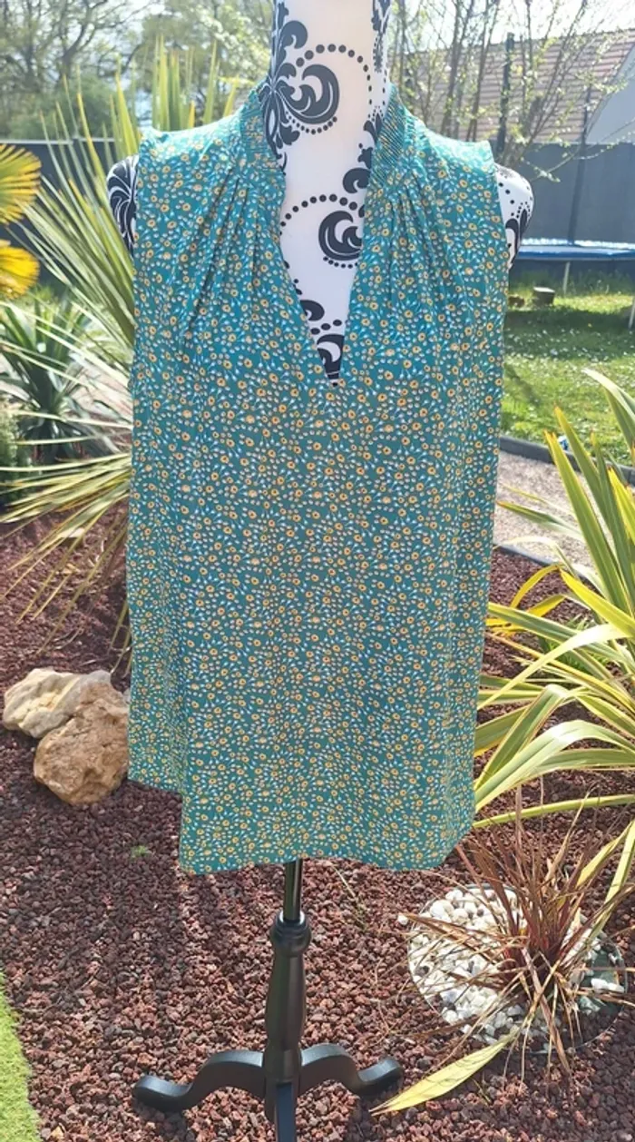 Jolie blouse femme sans manches 💚Couleur verte avec fleurs jaune 💚Matière très fluide et agréable à porter 💚Peu portée, elle est comme neuve 👌 Étiquette coupée mais correspond à une taille 42/44 #femme42_aurore4145 #femme44_aurore4145 #blousefemmedete #blousesansmanches