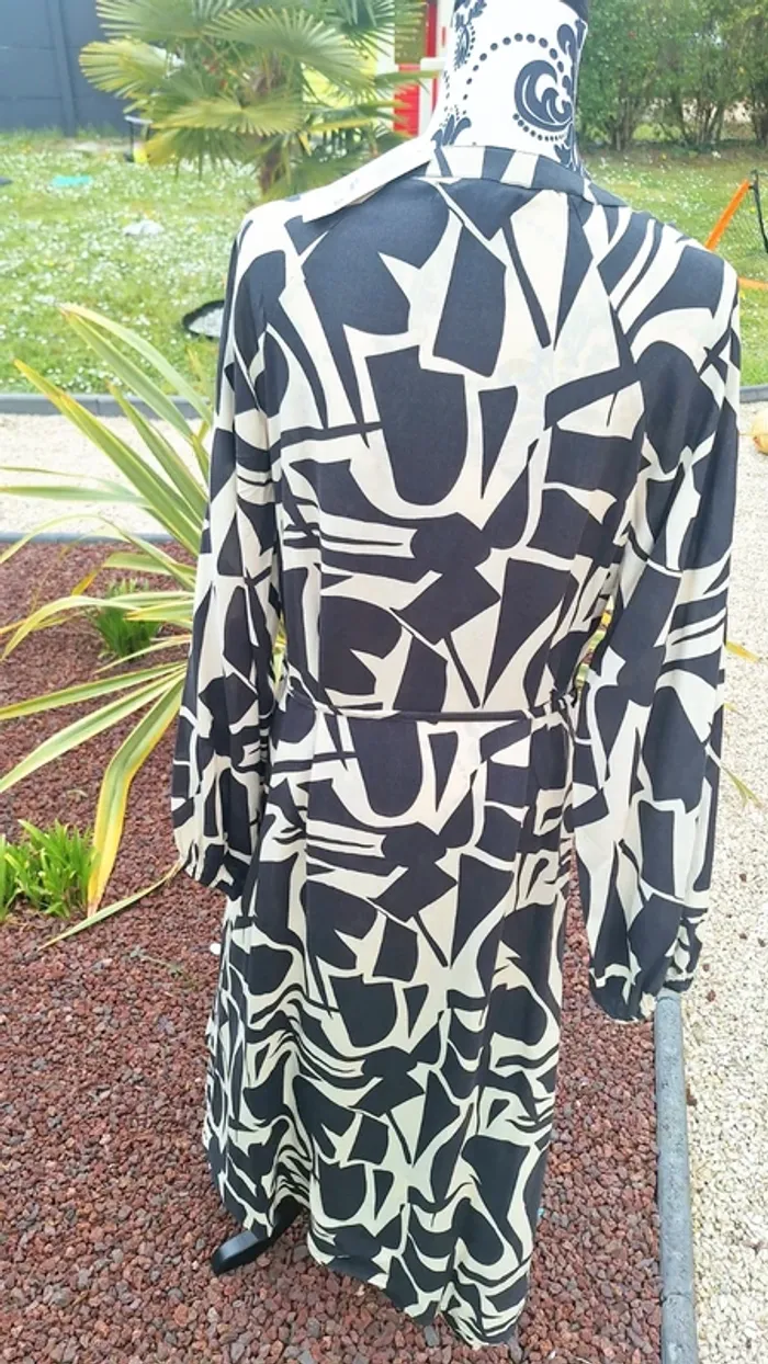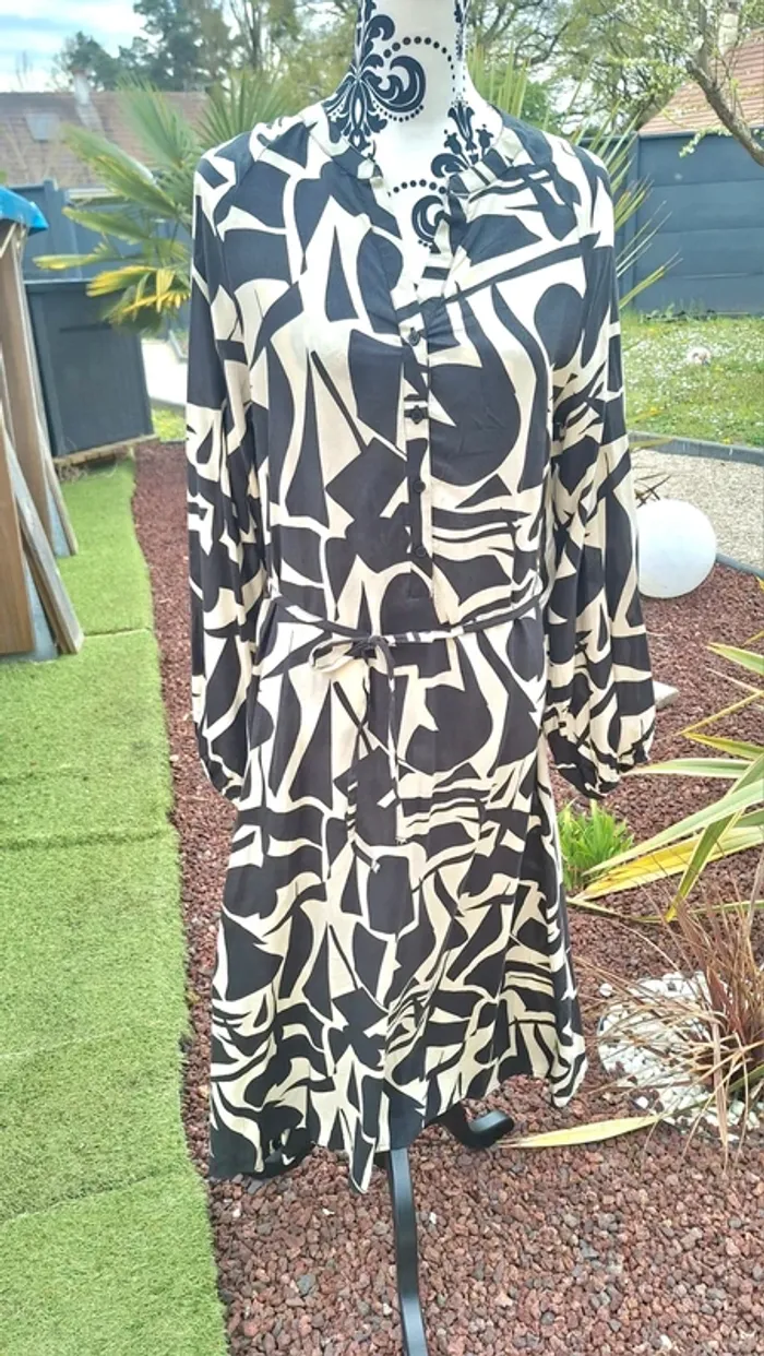 Sublime robe longue à manches longues ⭐️ Motif abstrait bicolore, noir et beige/crème. ⭐️ Elle est boutonnée sur le devant jusqu'à la taille et possède un col chemise. ⭐️ Une ceinture fine, du même tissu et du même motif, est attachée à la taille. ⭐️ Le bas de la robe est légèrement évasé et le tissu est léger et fluide. Taille 40, neuve avec étiquette 🏷 #femme40_aurore4145