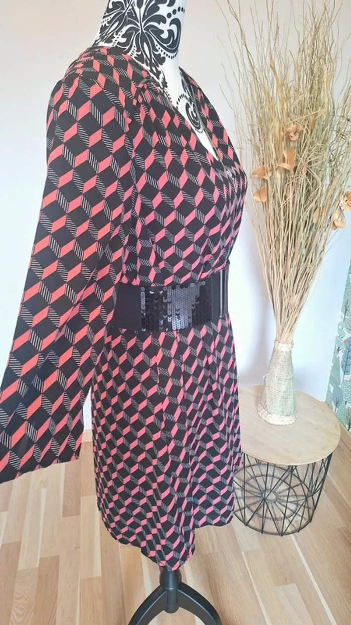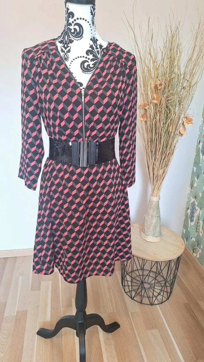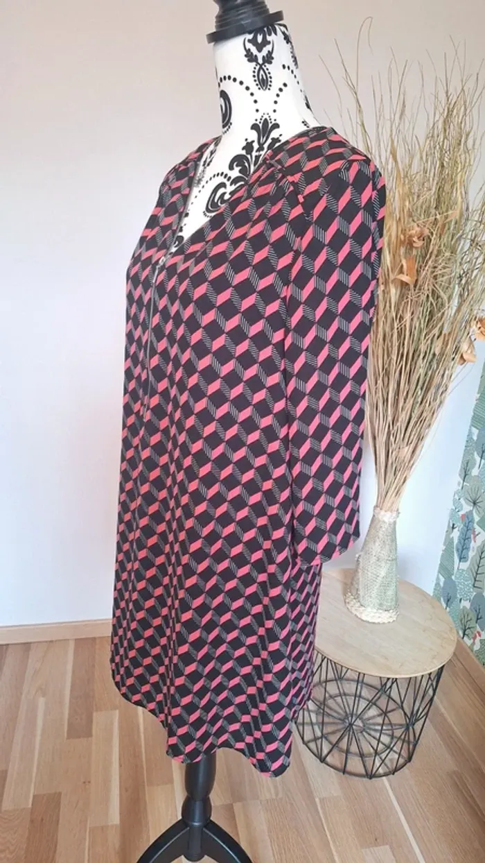 Jolie robe femme, style décontracté et élégant, présente un motif géométrique distinctif composé de cubes en 3D. La robe a une coupe droite, légèrement évasée, tombant au-dessus du genou. Elle semble ample et confortable. ⭐️ L'encolure est en V, fermée par une fermeture éclair argentée. ⭐️ ​Manches : Les manches sont longues, arrivant environ aux trois quarts, et ont une coupe ample. ⭐️ ​Matière : Le tissu est léger et fluide, idéal pour les saisons intermédiaires. ⭐️ ​Motif : Le motif est un trompe-l'œil composé de cubes noirs et roses créant un effet d'optique en 3D sur toute la surface de la robe. Portée 1 fois elle est neuve 👌 ⚠️vendue sans la ceinture ⚠️ #femme38_aurore4145