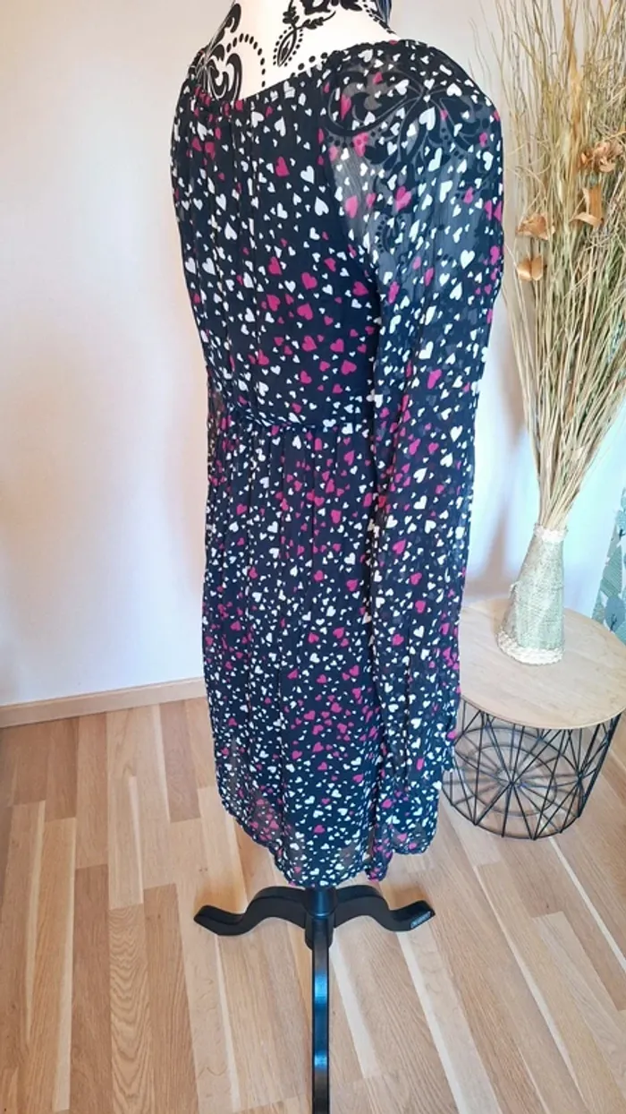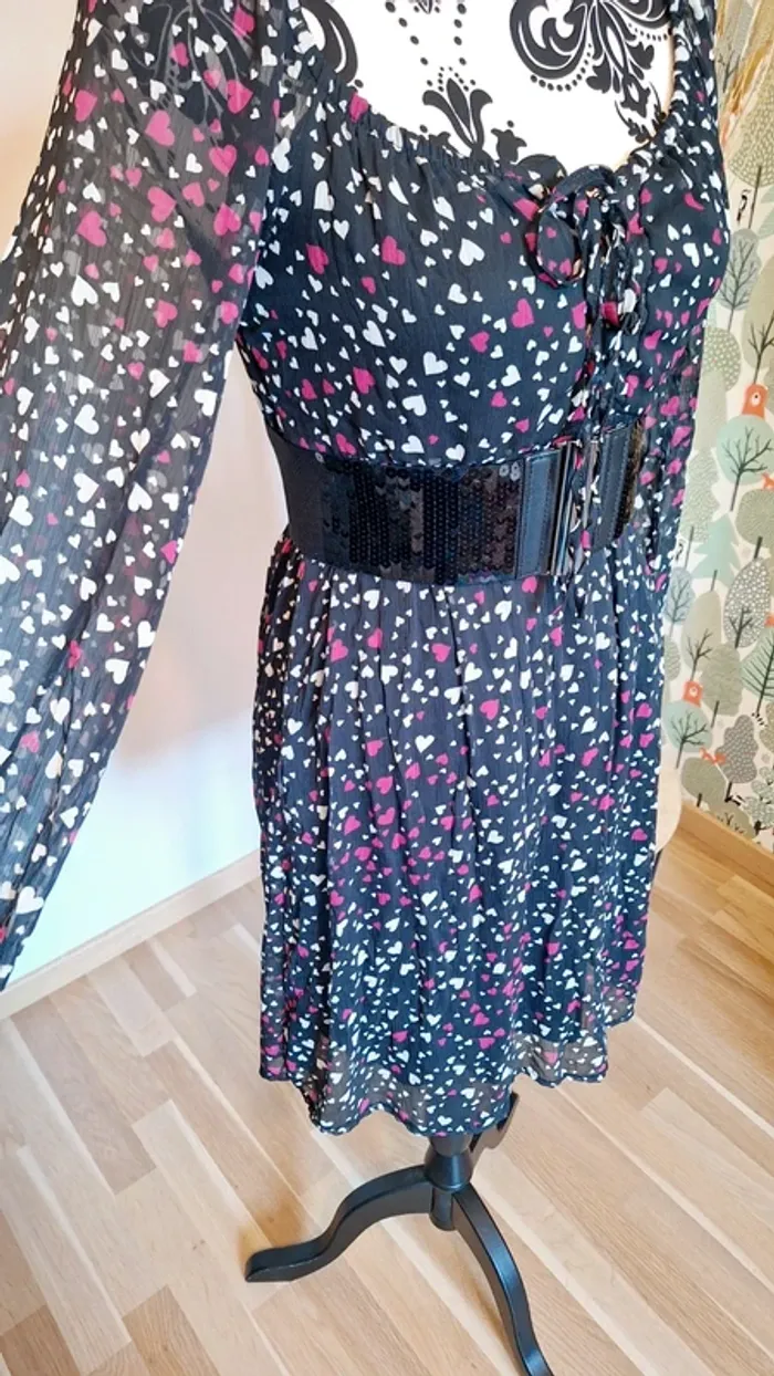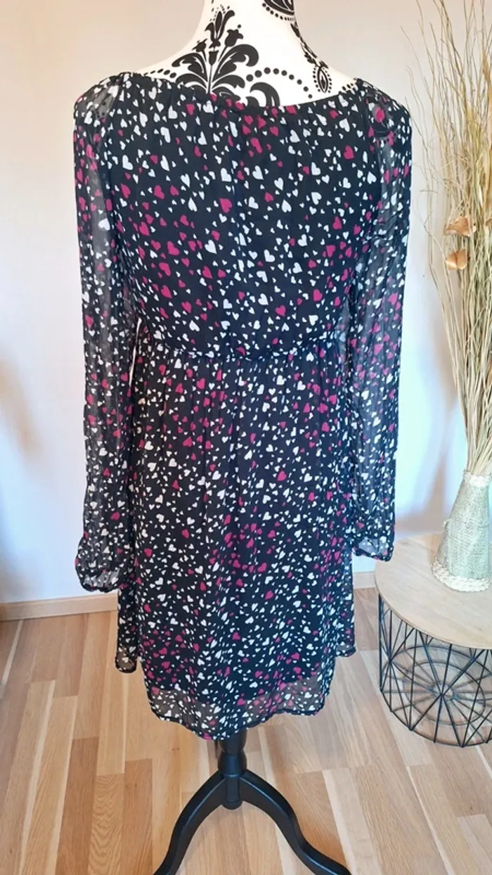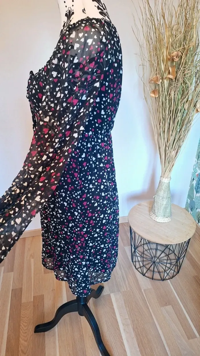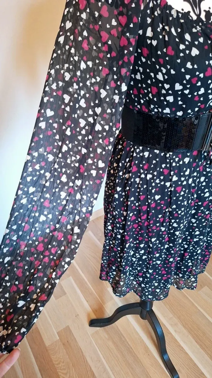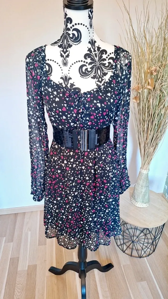 Sublime robe de couleur noire et ornée de petits cœurs dans les tons roses et blanc. ⭐️ ​Le col de la robe est de forme légèrement carrée et forme un joli décolleté plongeant. Un laçage est présent sur le décolleté. ⭐️ Les manches sont longues, transparentes et légèrement bouffantes aux poignets. ⭐️ ​La jupe de la robe est ample et courte. Taille 36 Comme neuve 👌 ⚠️ Vendu sans la ceinture ⚠️ #femme36_aurore4145