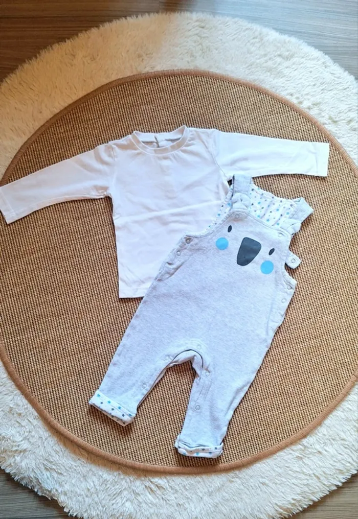 Ensemble garçon 🌱 Salopette en taille 9 mois Couleur gris clair Marque orchestra Bon état, le motif est un peu décollé au niveau du nez, voir la photo 🌱 Tee-shirt blanc à manches longues Taille 9 mois Ouverture boutons pressions dans le dos Très bon état 👌 #9moisgarçon_aurore4145 #ensemblegarçon #salopettegarcon9mois