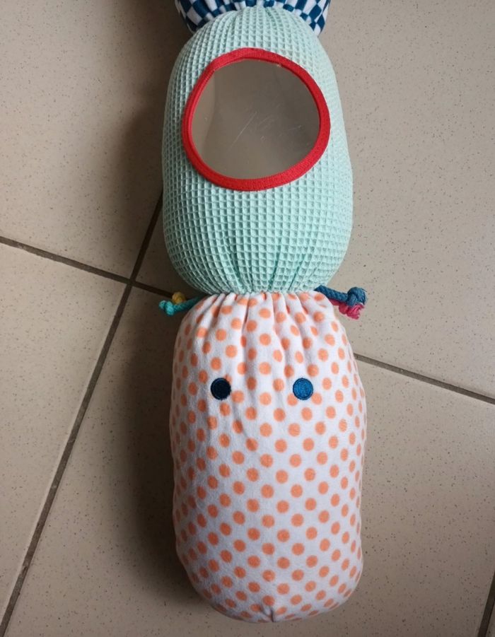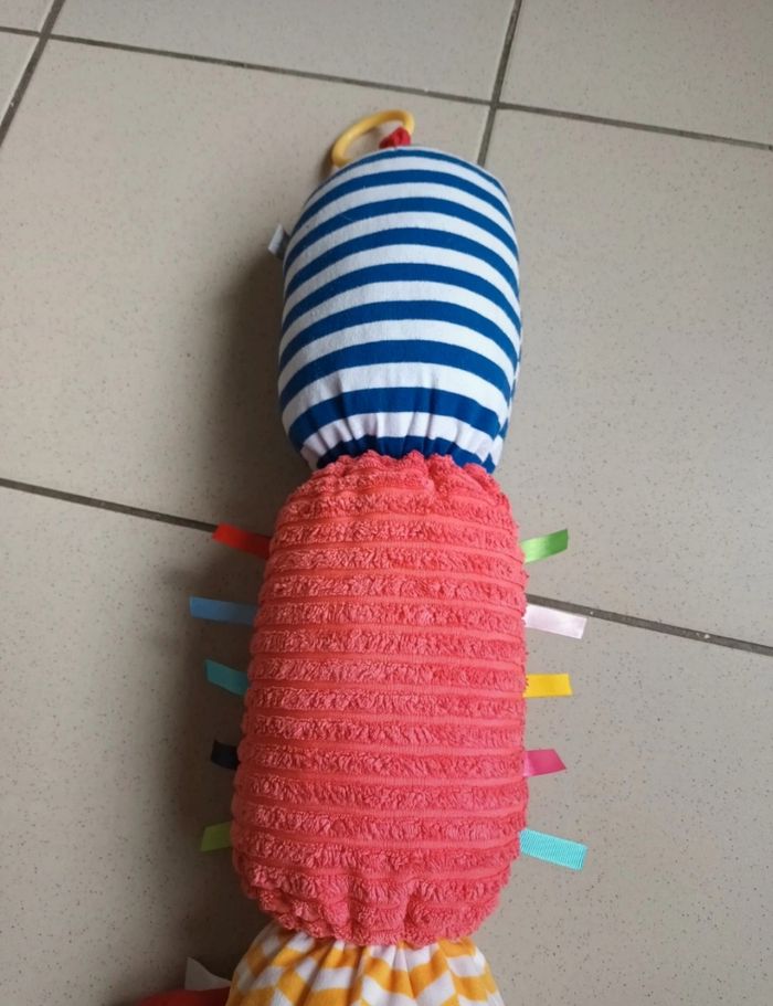 Cette grande chenille d'activités est composée de 6 boudins, tous de couleurs et de matières différentes. La chenille est douce, moelleuse, ses couleurs sont vives et ses motifs amusants. Chaque boudin propose au bébé une activité d'éveil différente : cordons, étiquettes, miroir, papier bruissant, anneau vibreur, anse à attraper. Ces activités stimulent ses sens. Il peut aussi se blottir contre sa chenille d'activités pour profiter de son épaisseur et de sa douceur. Le regard croisé des crèches Rigolo Comme La Vie sur nos produits :La chenille évolue en fonction des besoins de l'enfant. Elle passe de l'éveil sensoriel à la délimitation d'un espace lorsque l'enfant a besoin de se ressourcer et de se recentrer sur lui-même. Très bon état (quelques rayures sur le miroir)