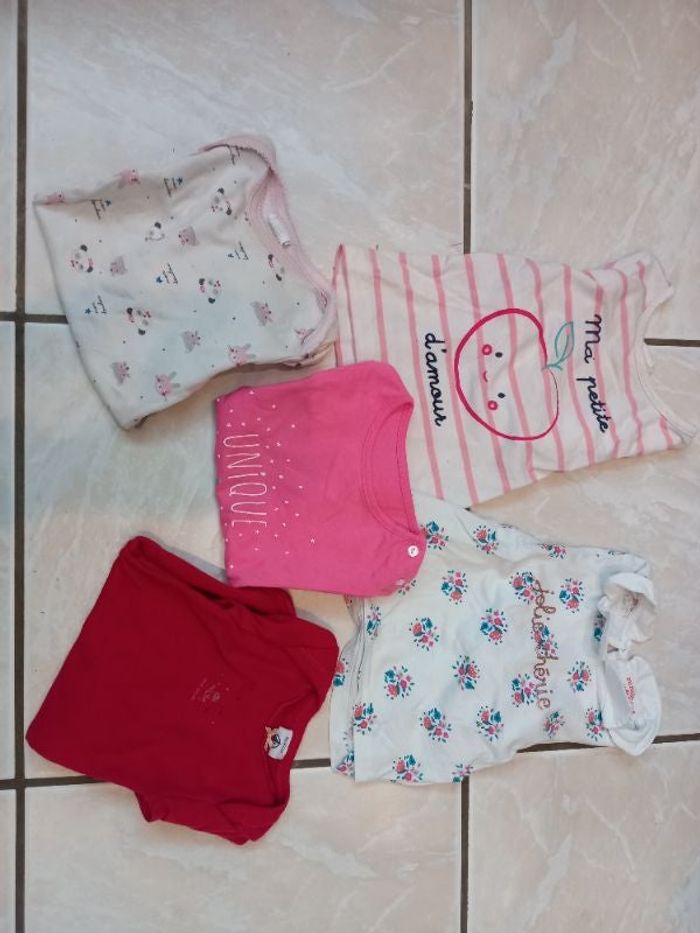 1 tee shirt MC kiabi 1 tee shirt manche longue fleuri du pareil au même 1 tee shirt manche longue avec pomme marque mots d'enfants 1 body rose et blanc manche longue marque absorba 1 body manche longue rouge marque petit bateau Tout est en très bon état #6moisfilleLiliie56