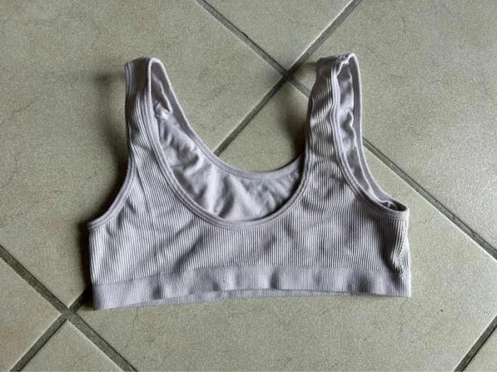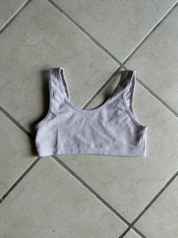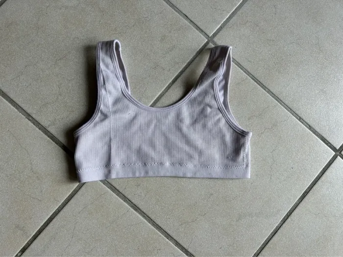 Brassière de sport côtelée beige Brassière de sport, neuve et jamais portée. Elle est de couleur beige, dans une matière côtelée très confortable. Elle n'a pas d'étiquette, mais correspond à une taille S/M. Elle offre un bon maintien pour les activités sportives à faible impact. Coloris : Beige / Nude Matière : Tissu côtelé extensible État : bon état, Idéale pour le sport, le yoga ou simplement pour être confortable à la maison. N'hésitez pas si vous avez des questions !