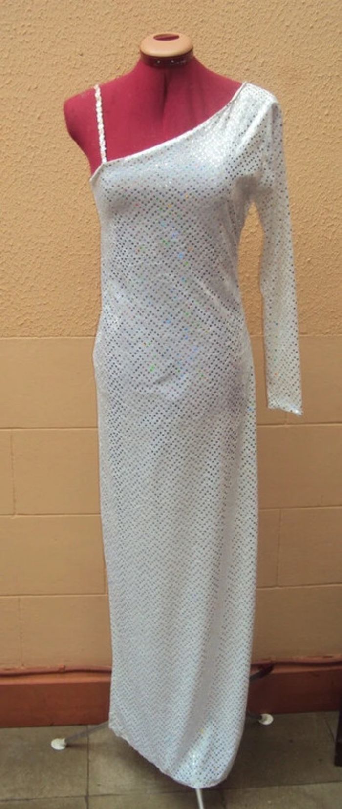 Sublime robe de spectacle, parfaite pour le cabaret, la danse ou les soirées à thème. Elle provient d’un ancien cabaret qui a fermé ses portes dans le années 1970 (Sortie de grenier, odeur de renfermé) ✨ Caractéristiques : • Taille : 38-40 (matière légèrement extensible pour un ajustement parfait) • Style : Asymétrique, avec une manche longue et une fine bretelle perlée pour un effet glamour • Couleur : Blanc irisé avec sequins scintillants • Longueur : Robe longue fluide, et fendue au niveau de la cuisse, idéale pour une allure élégante et sophistiquée 💃 Idéale pour artistes, danseuses ou passionnées de tenues de scène ! 📩 Me contacter pour plus d’infos ou photos supplémentaires.