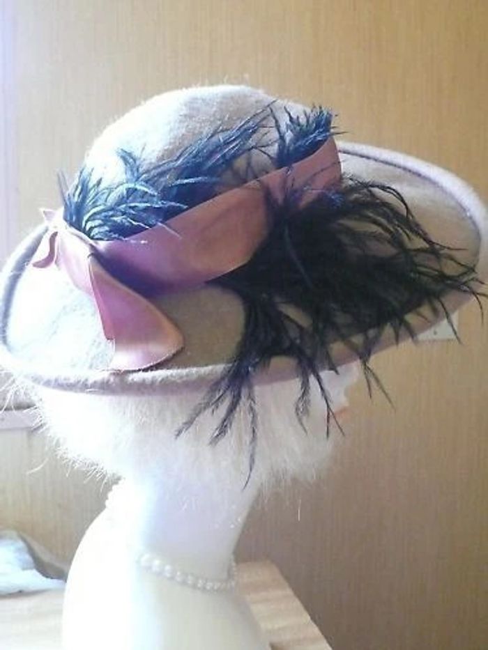 Chapeau 👒 années 1950 en feutrine et ruban agrémentée d’une plume d’autruche, Sortie de grenier (odeur de renfermé)