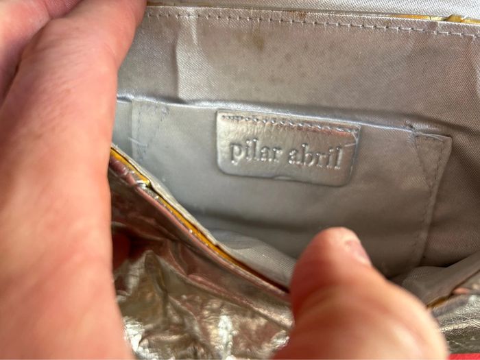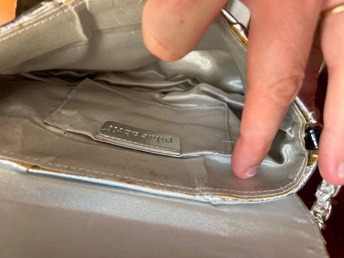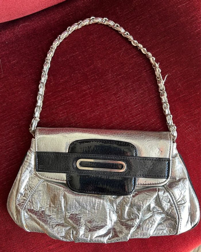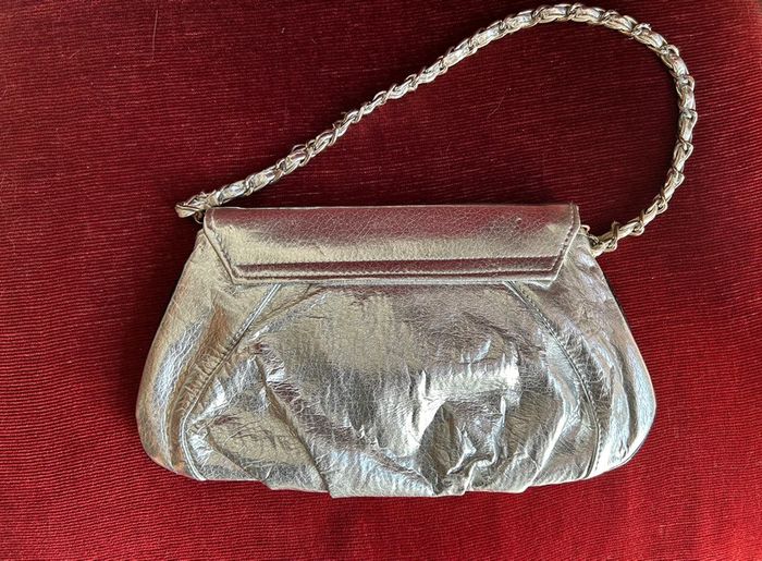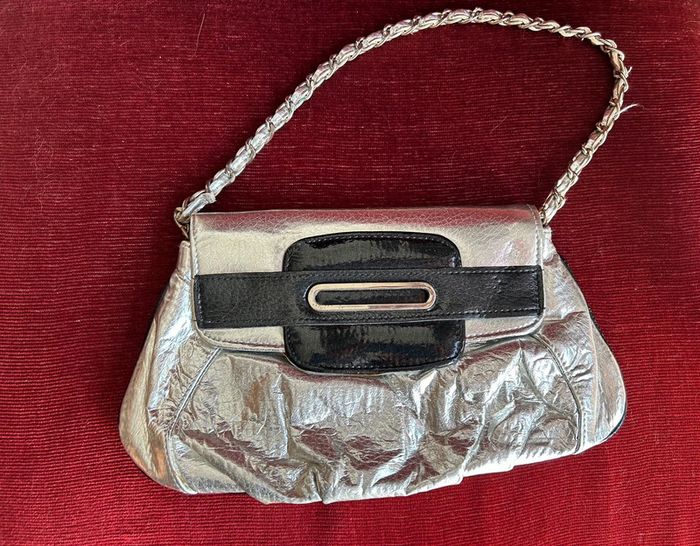 Sac à main Pochette simili cuir Couleur argenté Traces d’utilisation odeur de renfermé En l’état