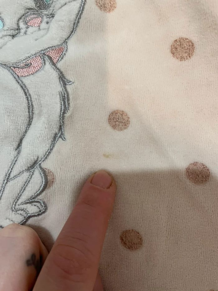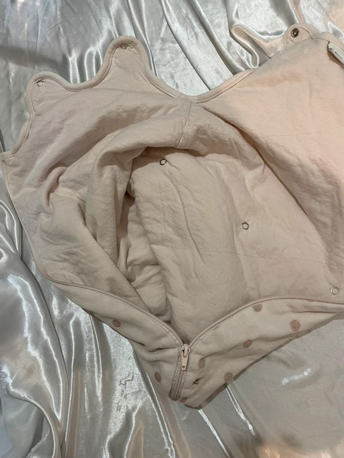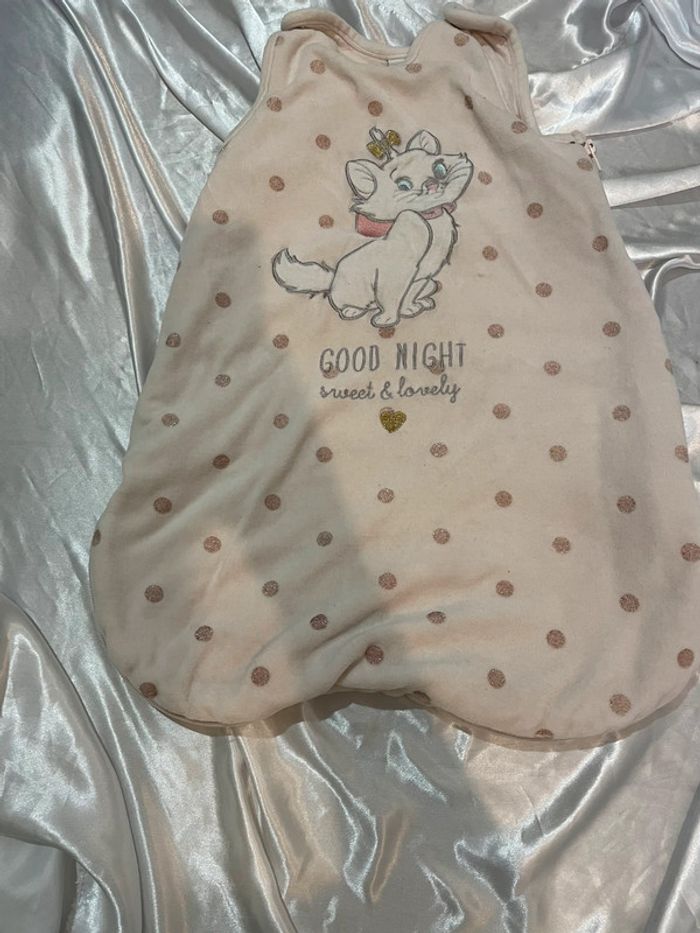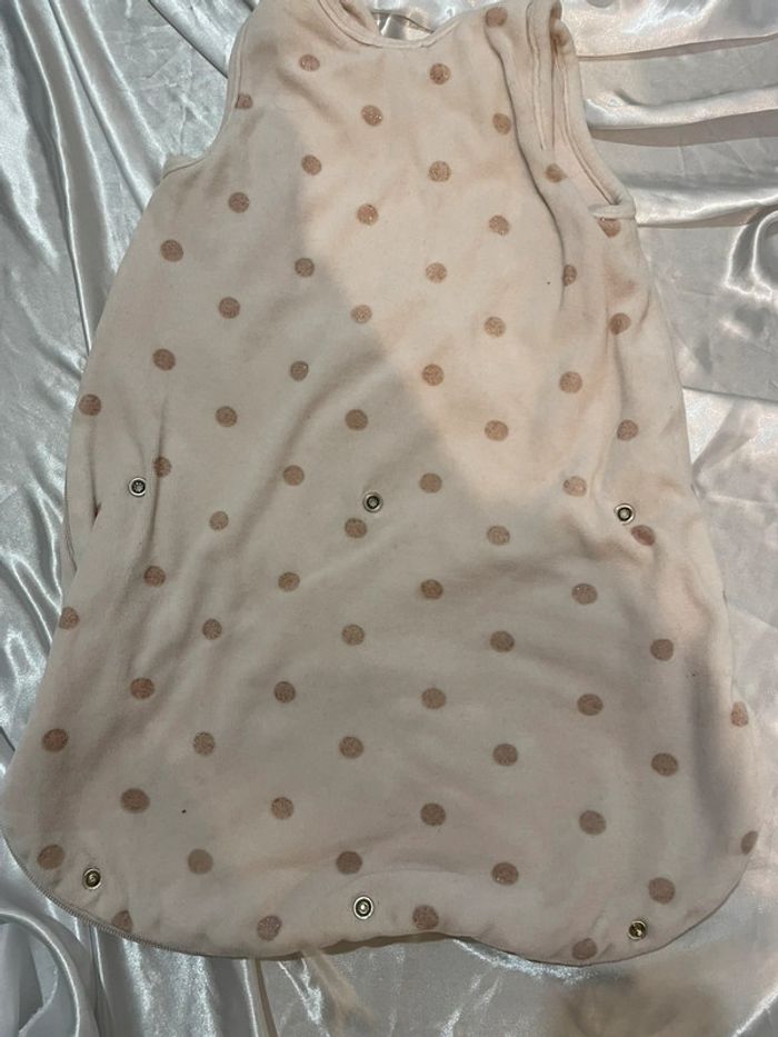 Gigoteuse avec petites taches voir photo, les paillettes sur les rond commence à s’enlever. Mais la gigoteuse reste en bon état.il y a pas d’étiquette, informant sur la Tote et taille
