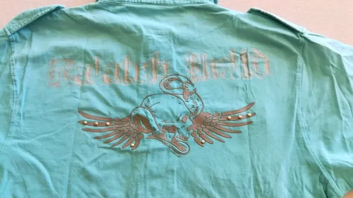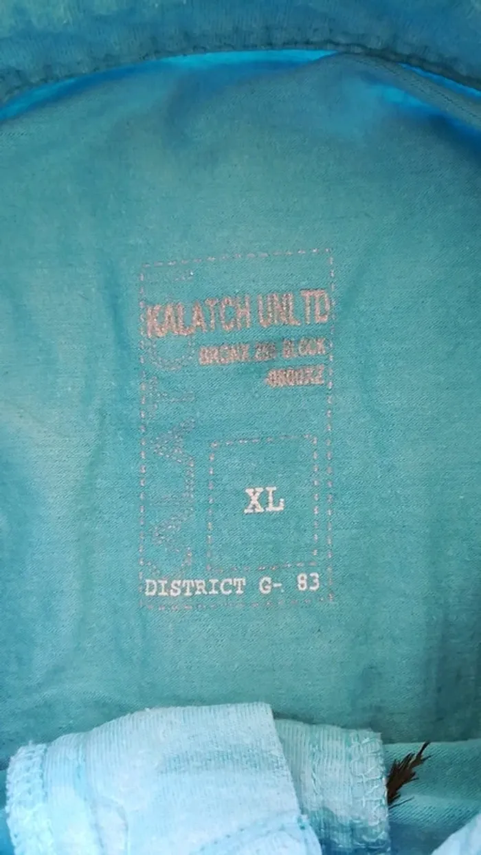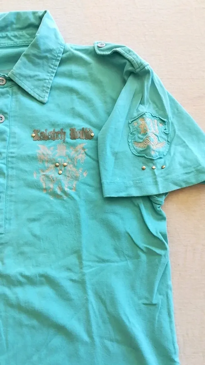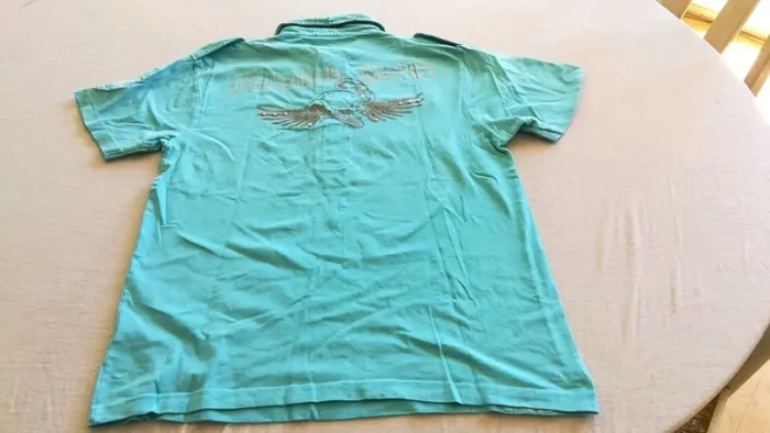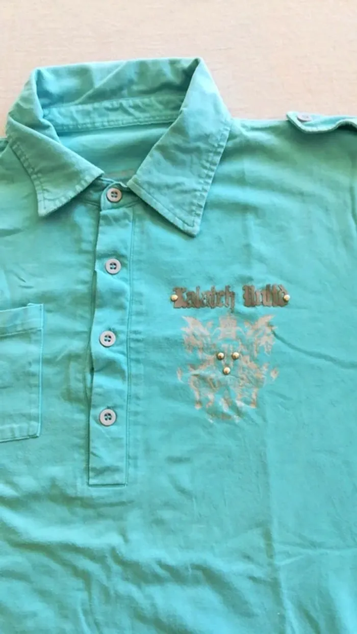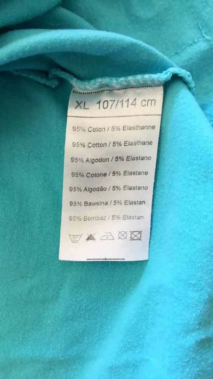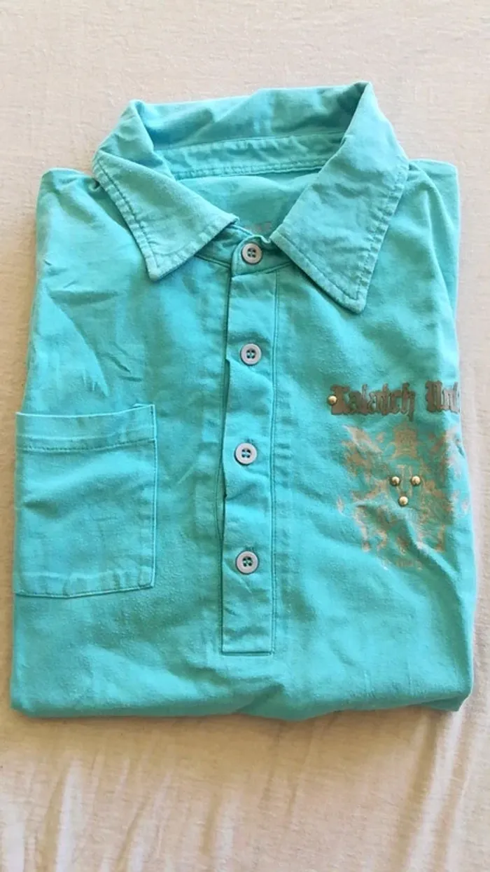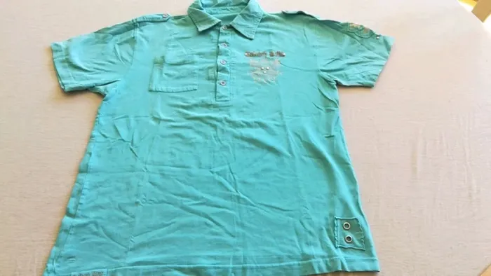 Polo bleu turquoise taille XL. Il se ferme au col avec 4 boutons et il y a une petite poche.