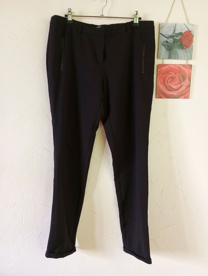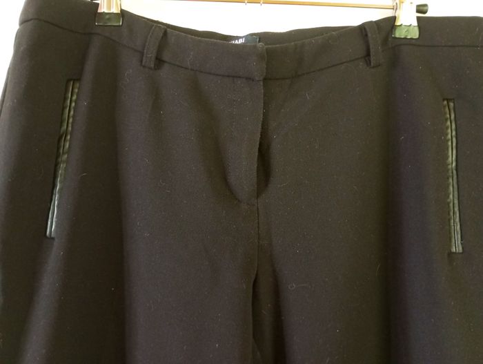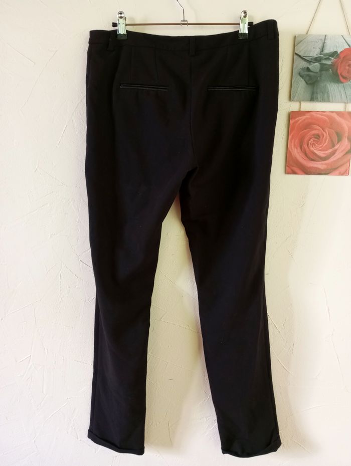 Très beau pantalon noir avec détails en simili cuir(liserés des poches). 2 fausses poches à l'avant et à l'arrière. Se ferme avec crochet et fermeture éclair. Petit revers en bas des jambes. Tissu légèrement extensible et un peu épais. Très bon état. Largeur à plat à la taille : 42,5cm, longueur à partir de l'entrejambe : 77cm, longueur totale : 98cm environ. #frip_femme42