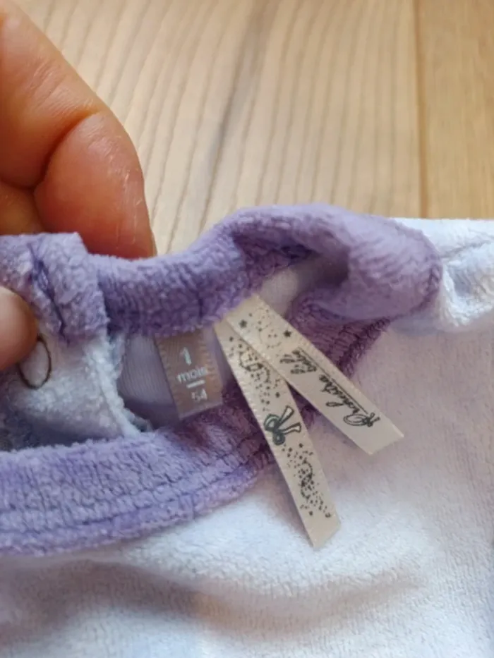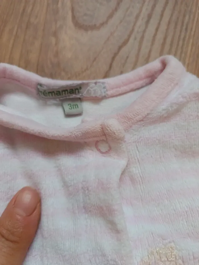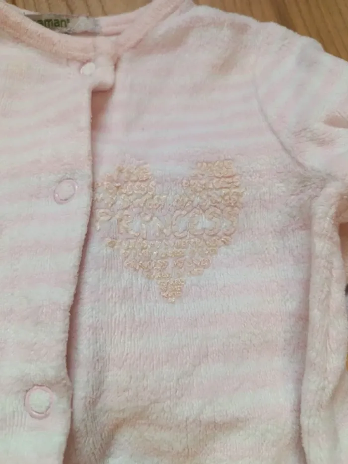 2 pyjamas Orchestra, taille 1 mois (même si le rose est noté 3 mois il correspond plus à 1 mois), il est ouvert également entre les jambes avec des pressions. Matière velours