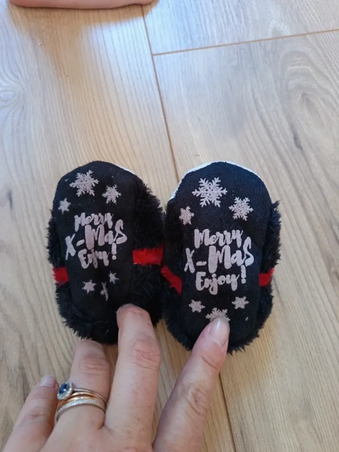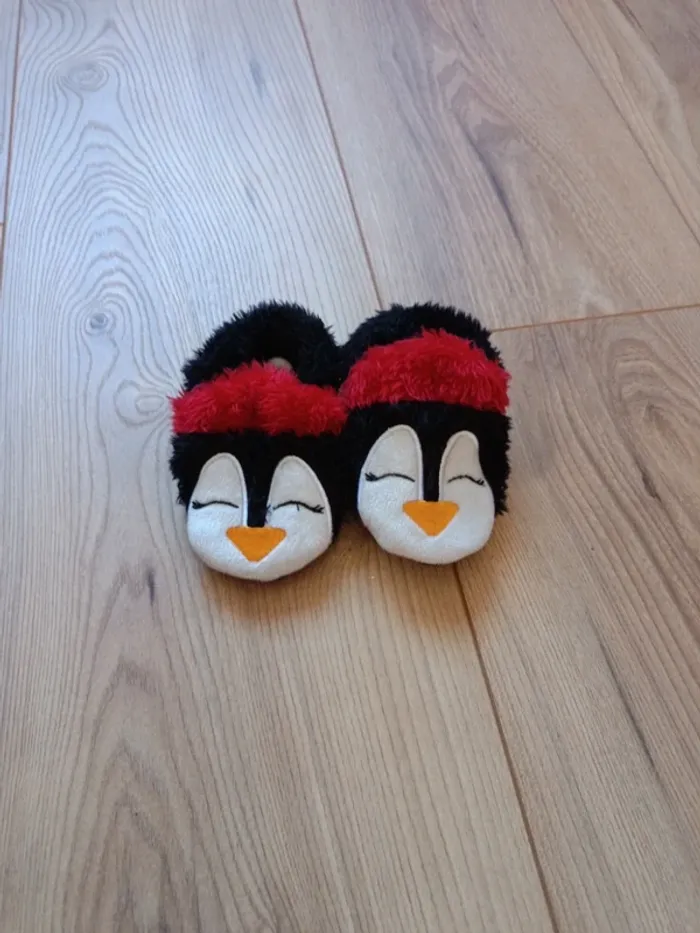 Chaussons bébé noël, petit pingouin, taille 6 mois environ. Portes 2 fois. Noir et rouge, tout doux.