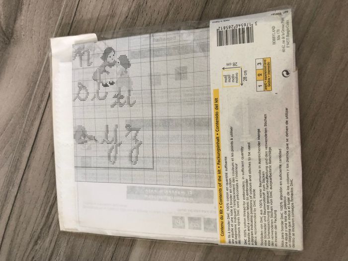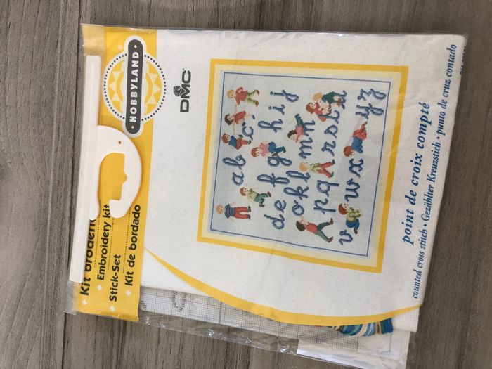 Kit complet de point de croix compté, représentant un abécédaire. Contenu du kit: des fils à broder DMC 100% coton, une aiguille, une toile à broder en coton, un diagramme du modèle. Taille motif: 28*28cm