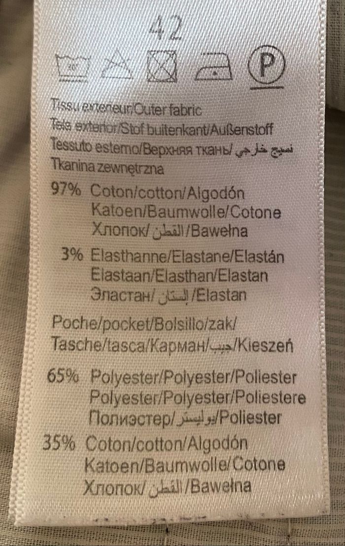 Pantalon Slim Sans tache Taille XL(42) Ouverture avec une fermeture, un bouton et un crochet 97% coton 3% elasthanne Poche 65% polyester 35% coton