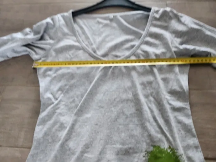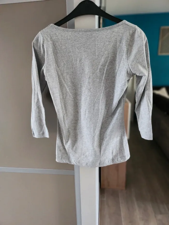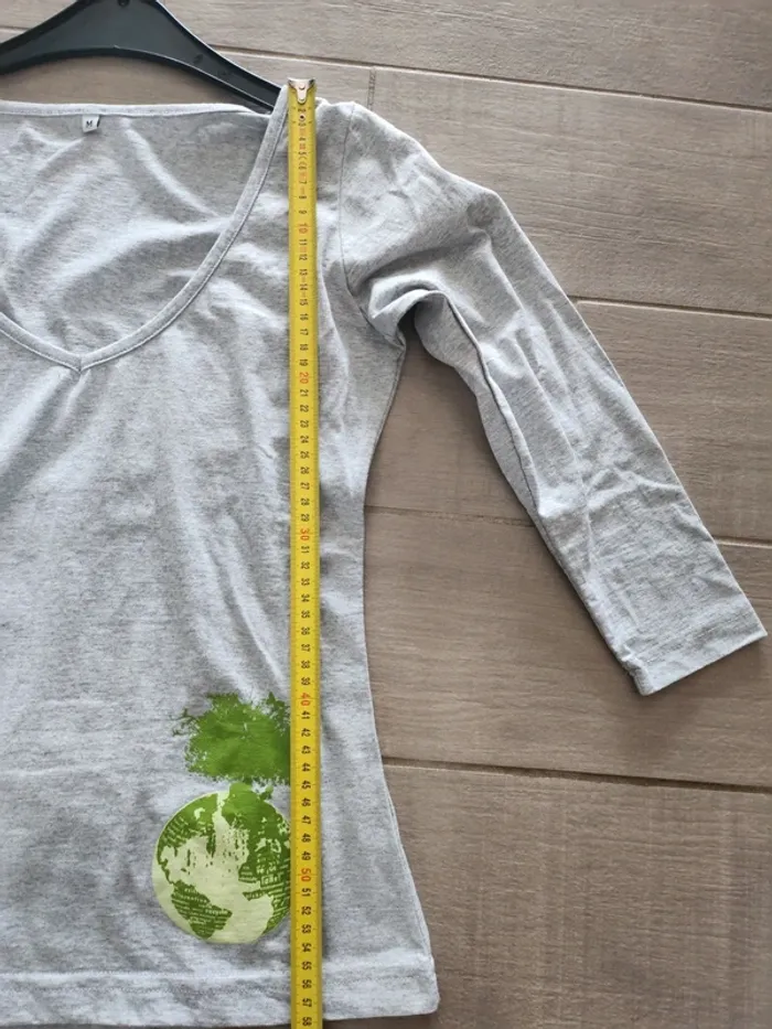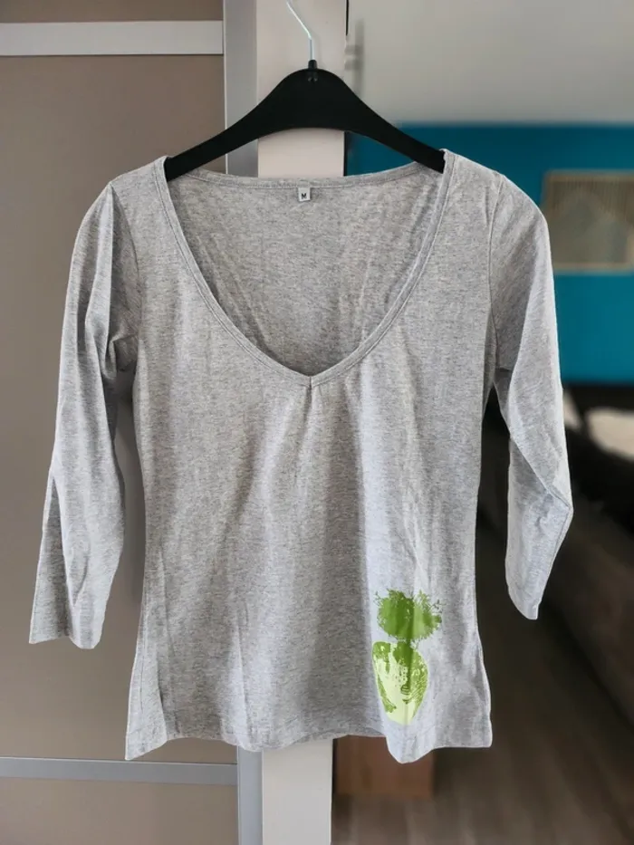 ➡️ haut tee-shirt manches longues gris clair avec dessin planète et arbre vert col é V