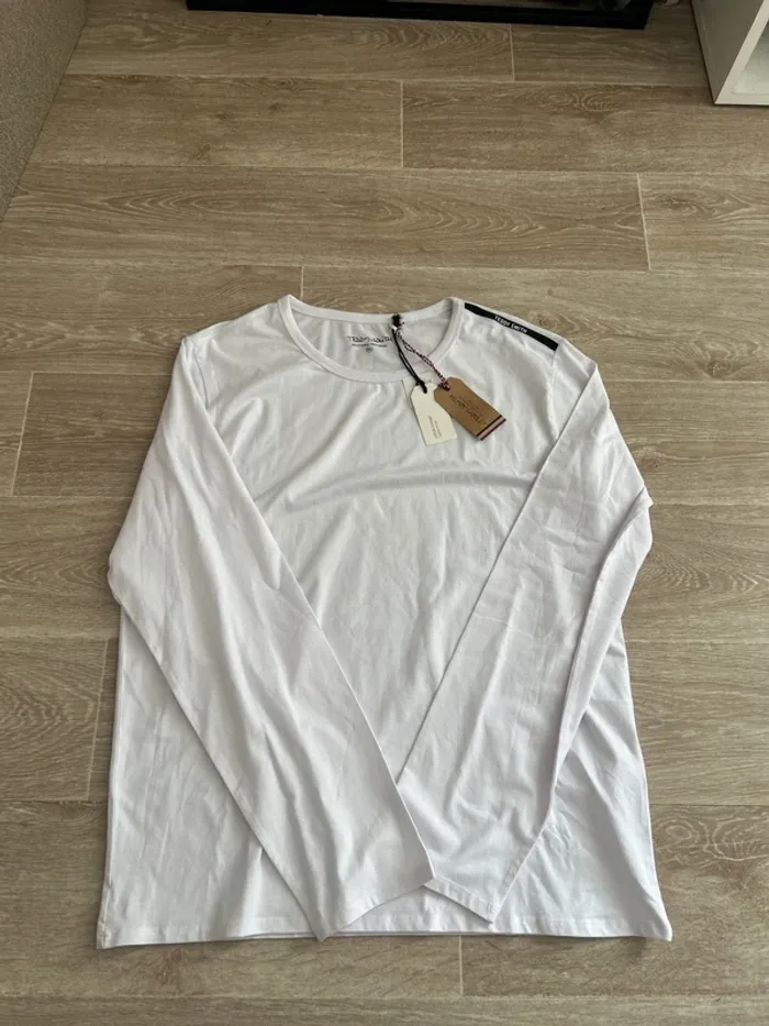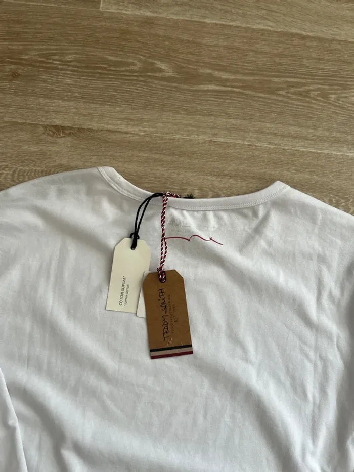 Bonjour, je vous propose ce joli T-shirt à manches longues neuf original jamais porté de chez Teddy en grande taille 3XL d’un blanc éclatant avec sa petite bande noire sur l’épaule.
