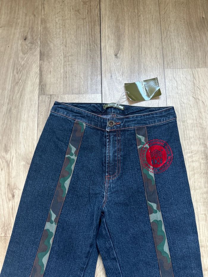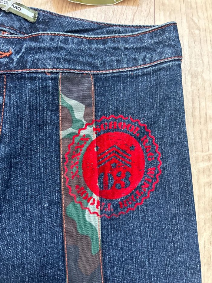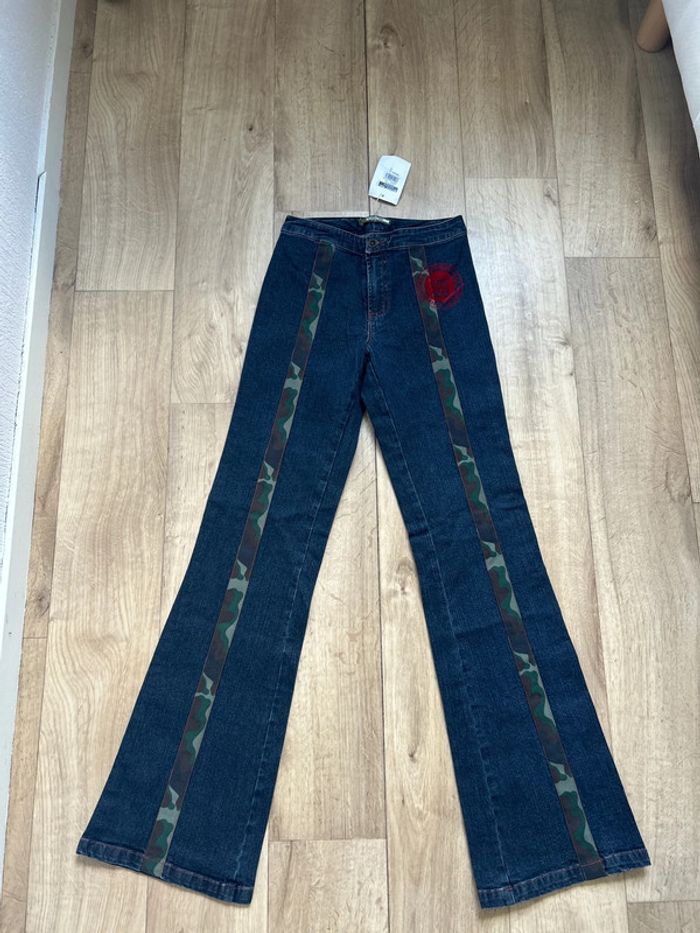 Bonjour, je vous propose très joli jean, neuf original jamais porté de chez School Raag avec ses bandes couleur camouflage militaire joli coupe flare pattes d’éléphant Taille 28 américaine intermédiaire correspond à du 36 français (s).