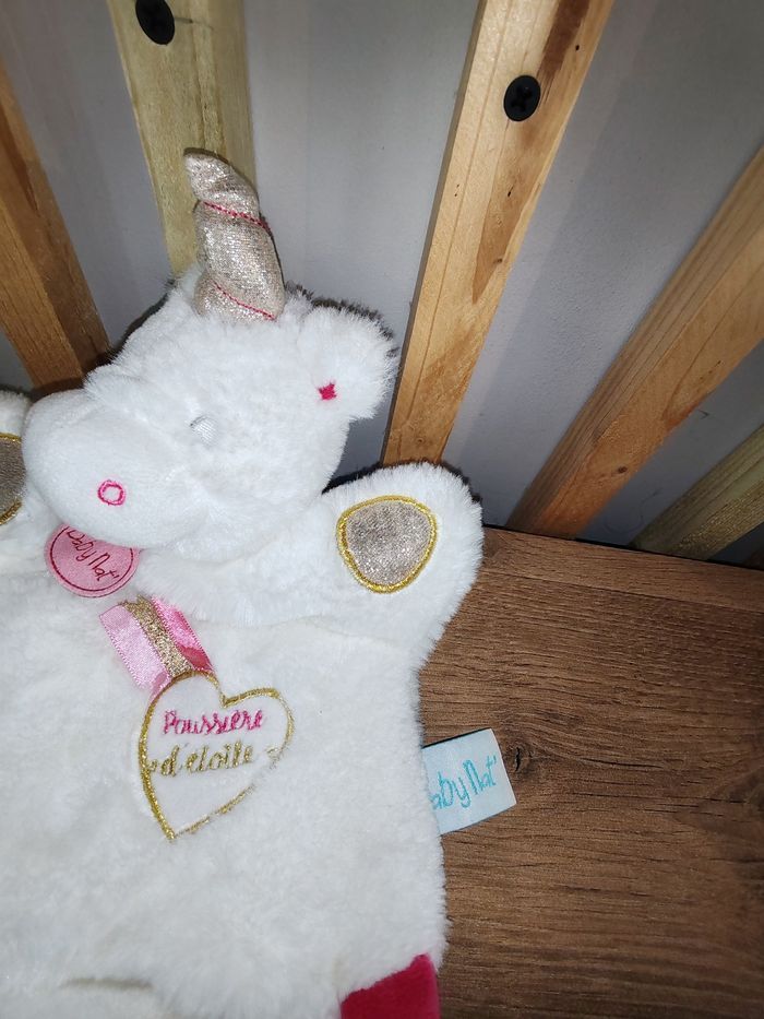 Marionnette Licorne Blanc Rose Doré Poussière Etoile BABY NAT’ Tbe Toute douce Étiquette marque présente 9.90 euros Envoi en relais