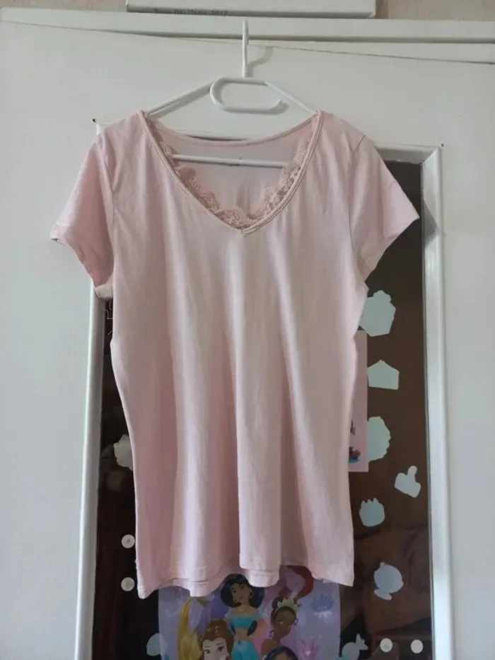 Tee-shirt dentelle rose écrit taille 46/48 mais taille plutôt 44/46