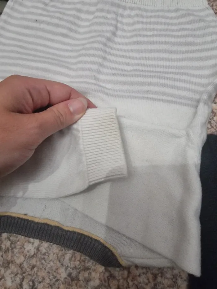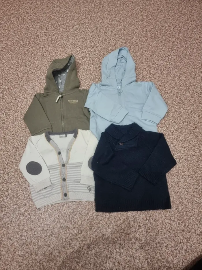 Lot 2 veste bleu kaki, 1 pull bleu, 1 gilet bon état car légère tâche a la manche 6 mois