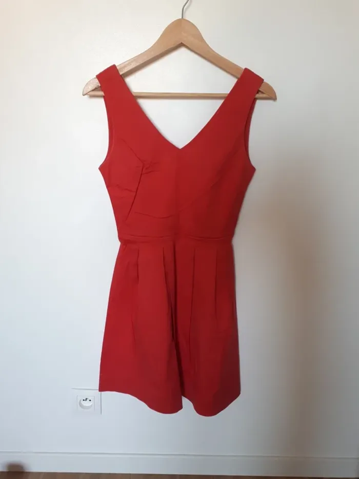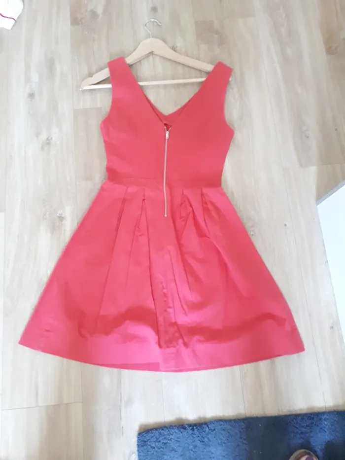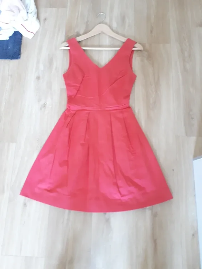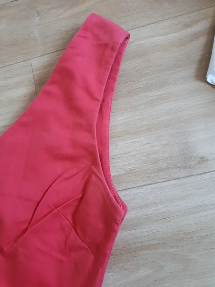 Robe sans manche cintrée en très bon état À été portée et peut être tissu un peu plus 'blanchi' au niveau des bras et ceinture cf photo 5 cela reste minime! Robe rouge framboise pas rouge vif comme peut le montrer les photos ! #34lucie100281