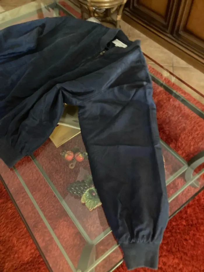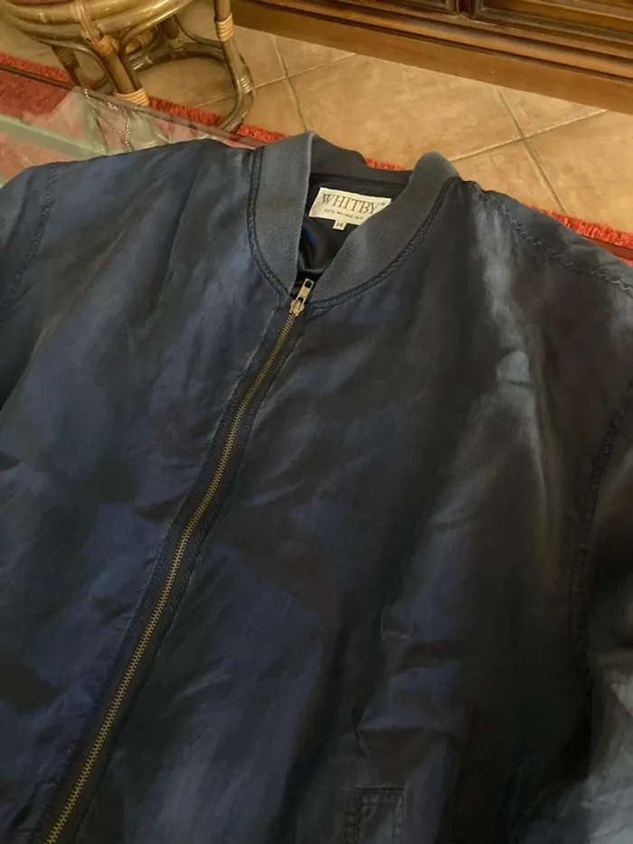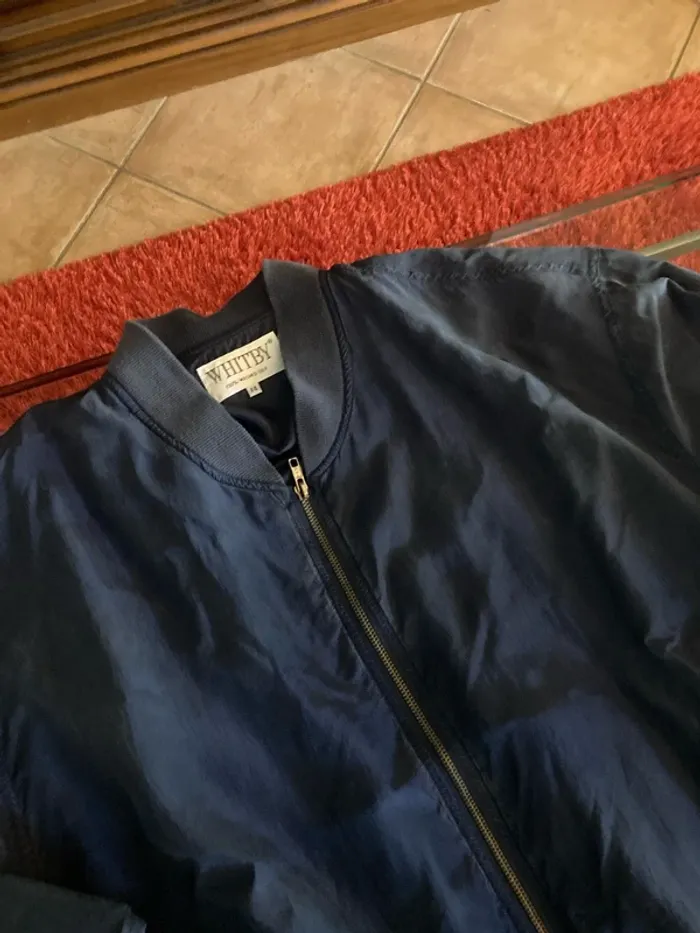 En 100 % soit lavé en très bon état Peu porté Silk Bomber Jacket bleu marine épaulettes zippé avant surdimensionné XL en soie lavé des années 80 #vintage #vesteensoie #whitby