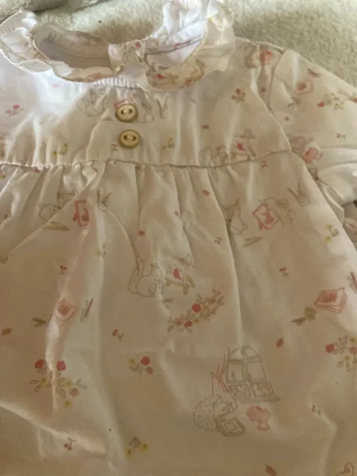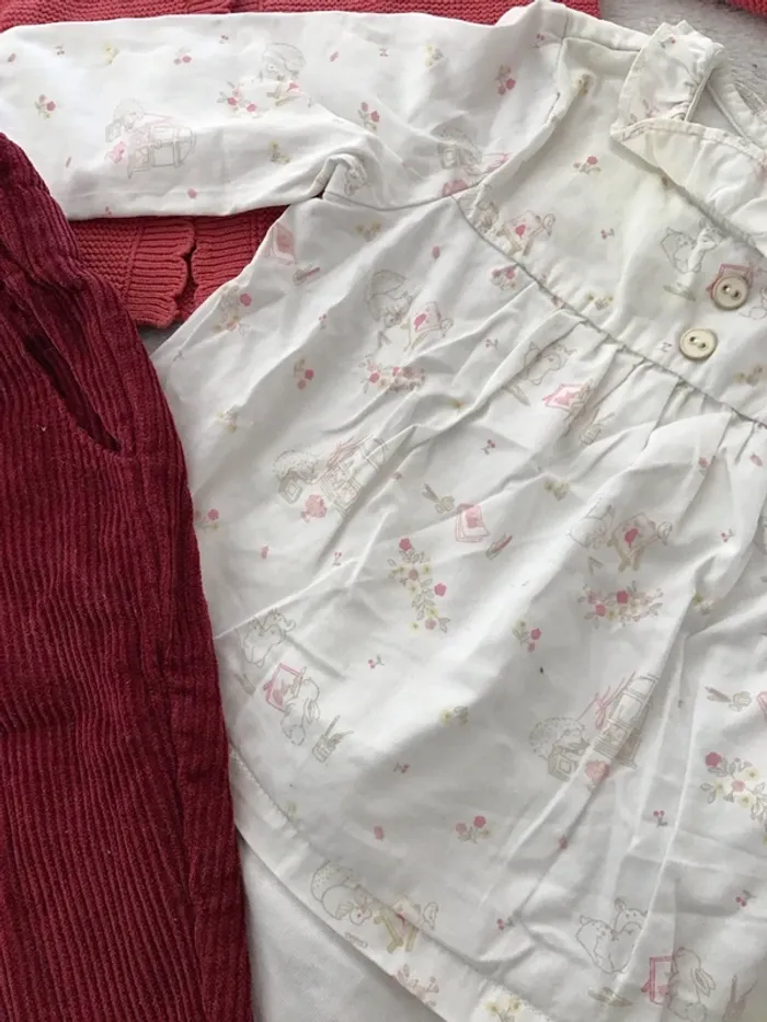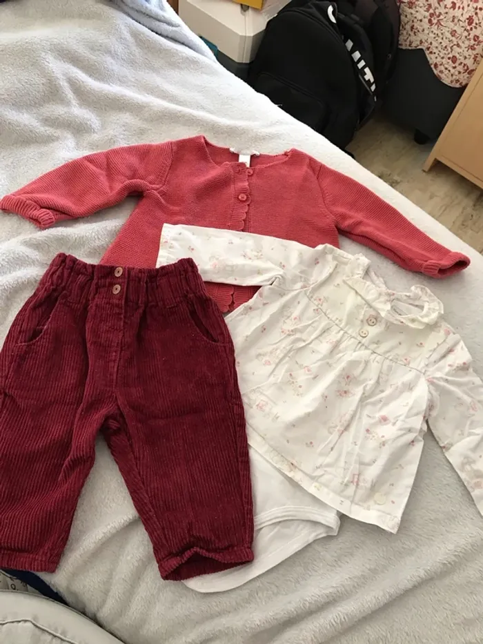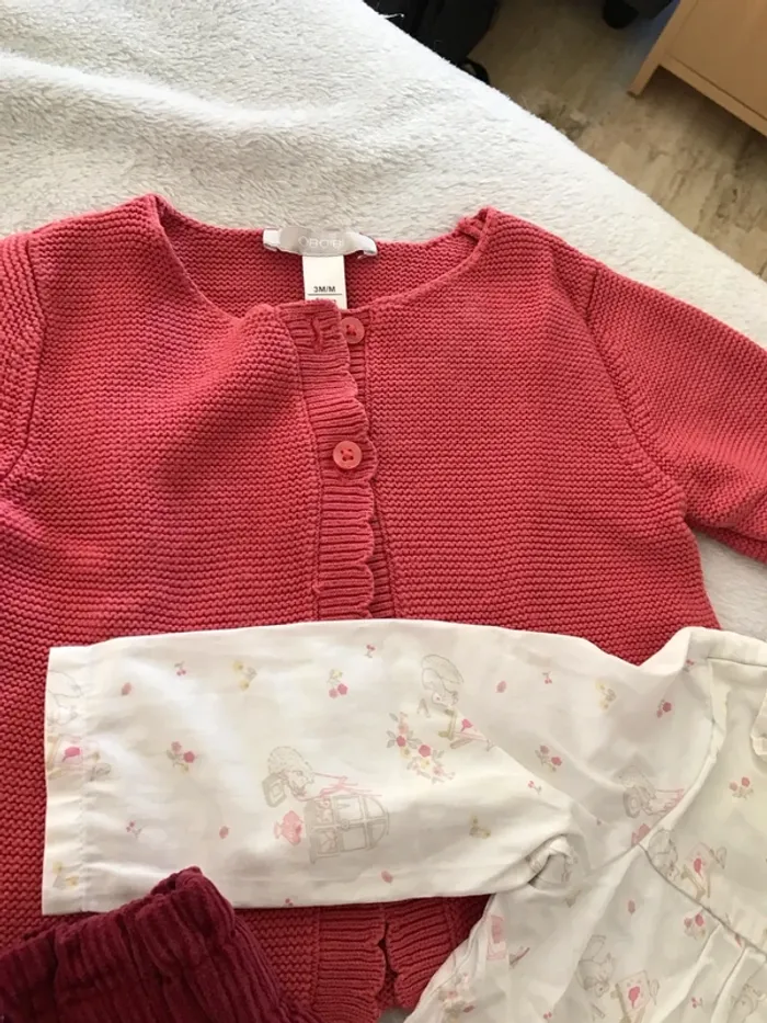 En très bon état Body, chemisier blanc, à motifs animaux, sergent Major Pantalon mauve Kiabi et veste rose Obaibi