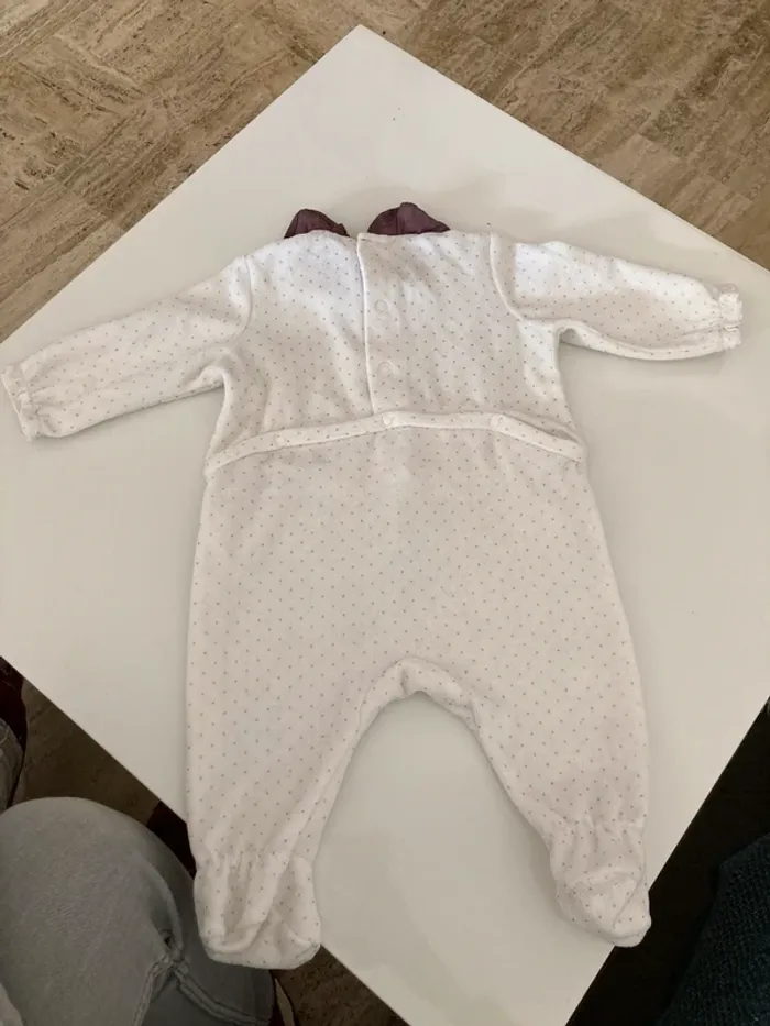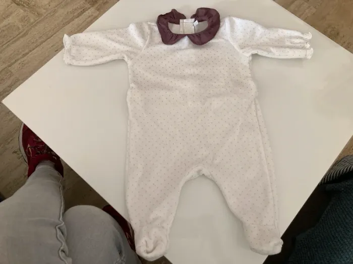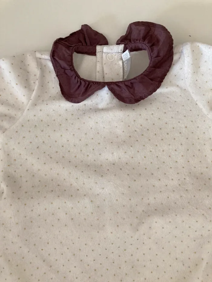 Pyjama ouverture au dos Il est blanc à pois doré avec un col violet porter quelques fois, mais reste en très bon état