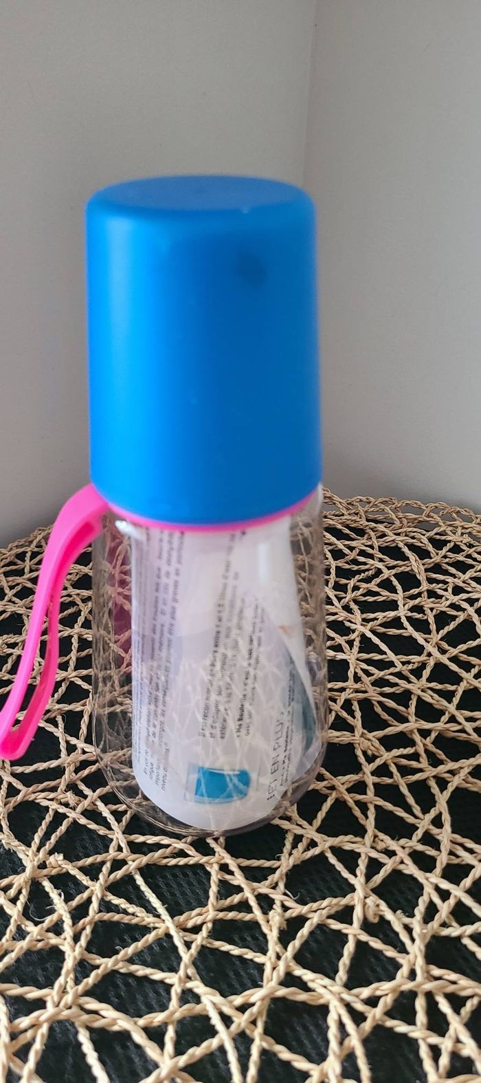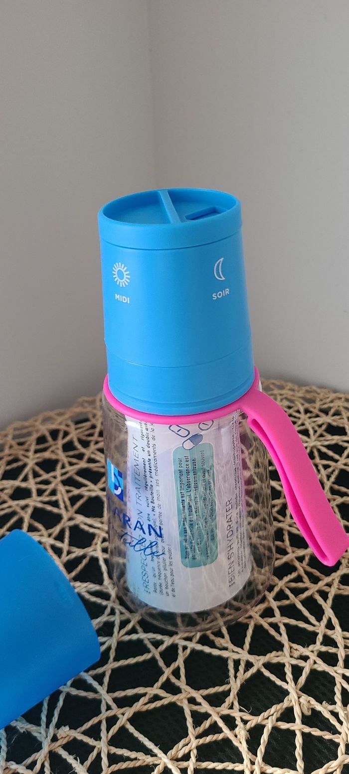 Bouteille pilulier Biogaran. Permet de faire suivre son traitement médical pour la journée (matin, midi et soir). Le bouchon sert de gobelet.
