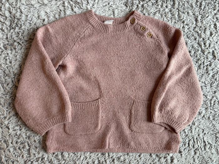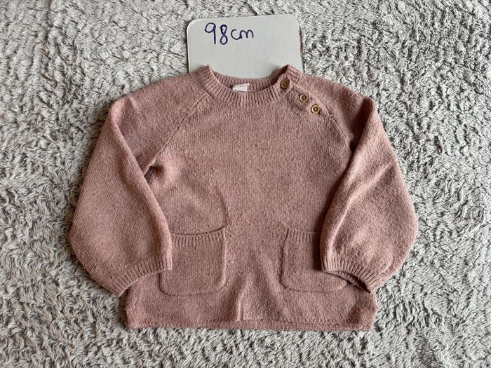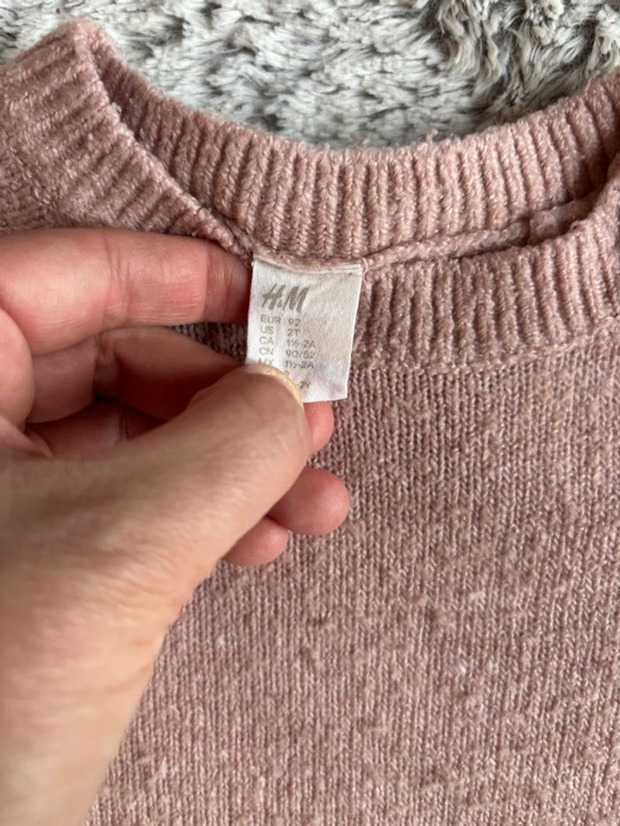 Pull H&M étiqueté 92cm mais taille vraiment grand donc plutôt 98cm. La laine a un peu bouloché à l’usage, voir photos.