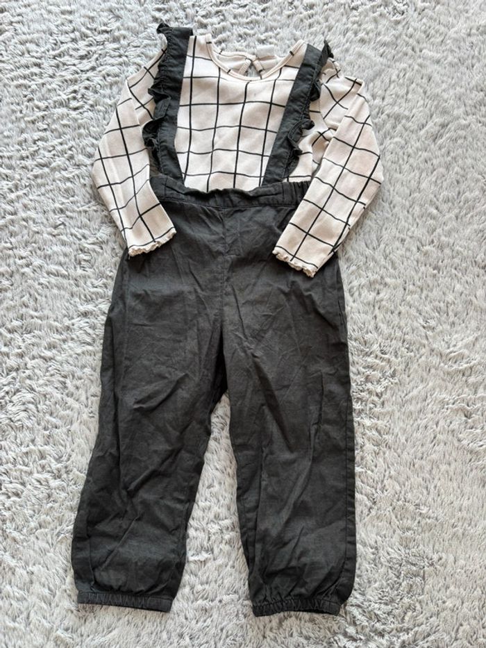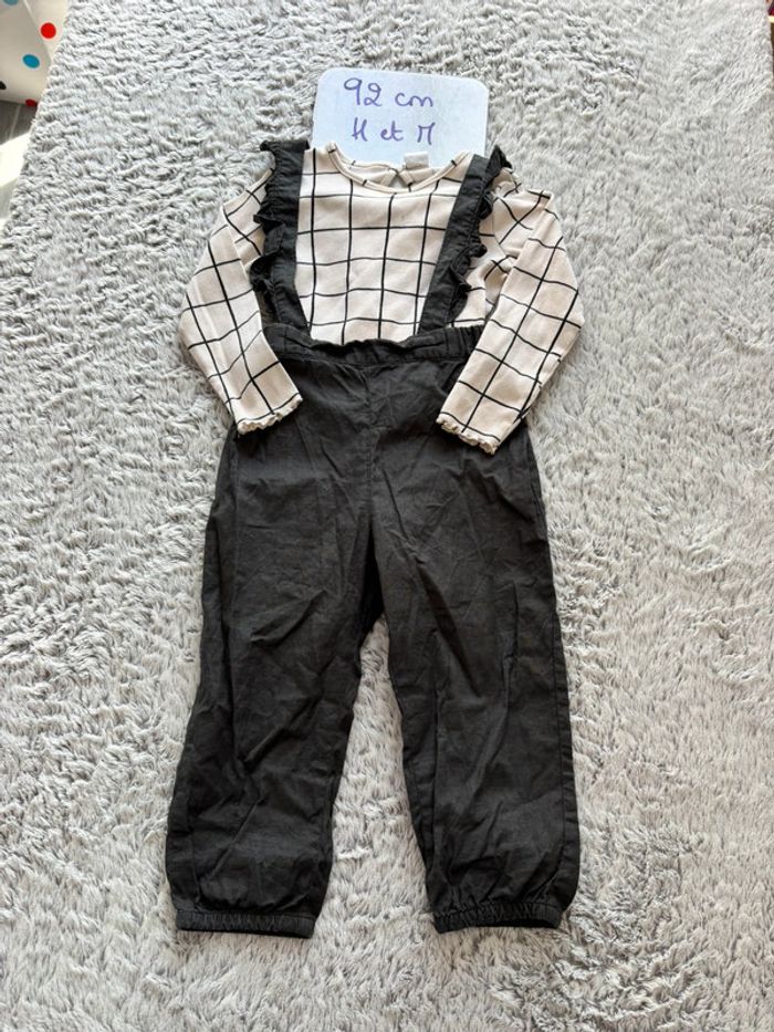 Ensemble H&M taille 92 cm comprenant un tee shirt manches longues et un pantalon salopette. ⚠️ petite tache à l’arrière du pantalon, voir dernière photo