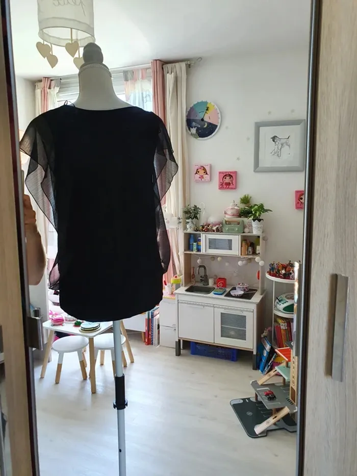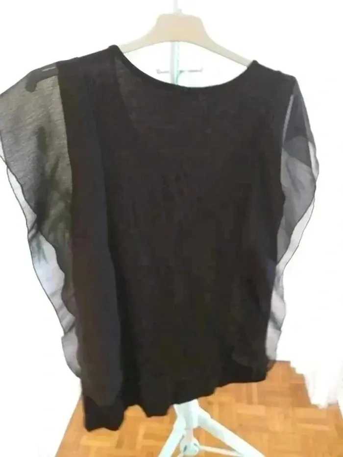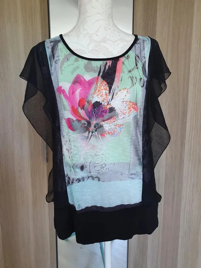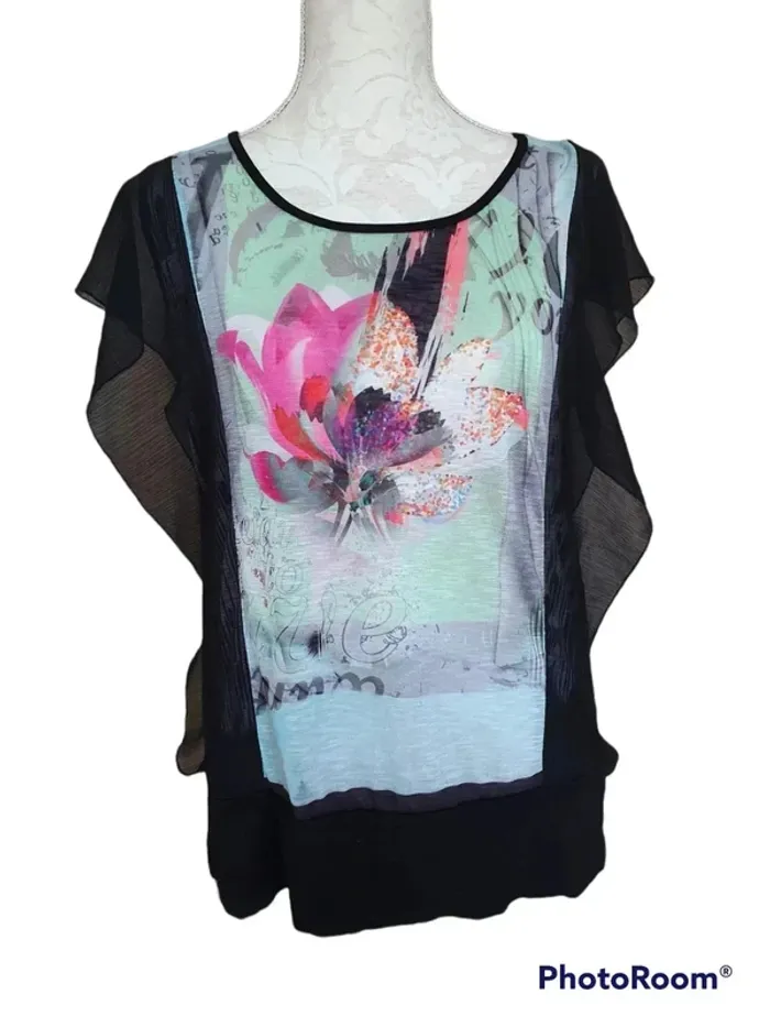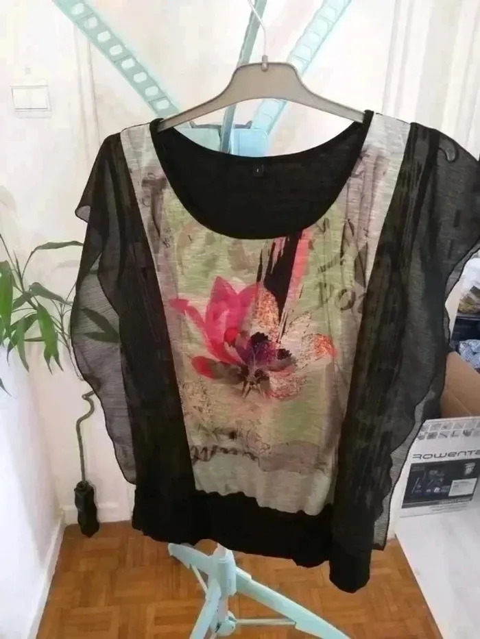 Tee shirt taille 38 M noir à volants transparents Peinture fleurie #delphinegartailleM #delphinegarnew