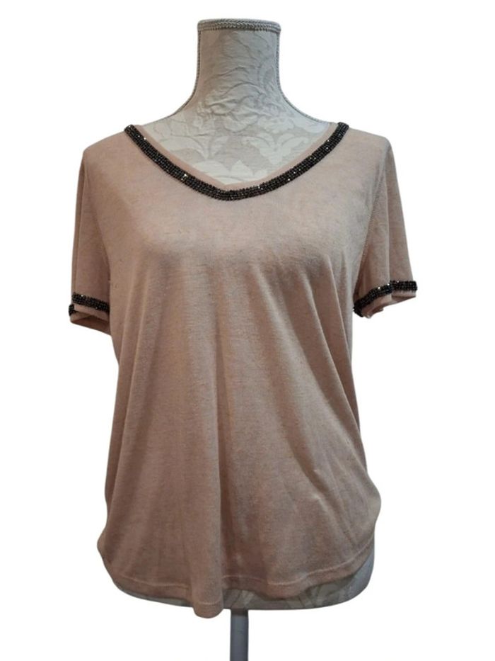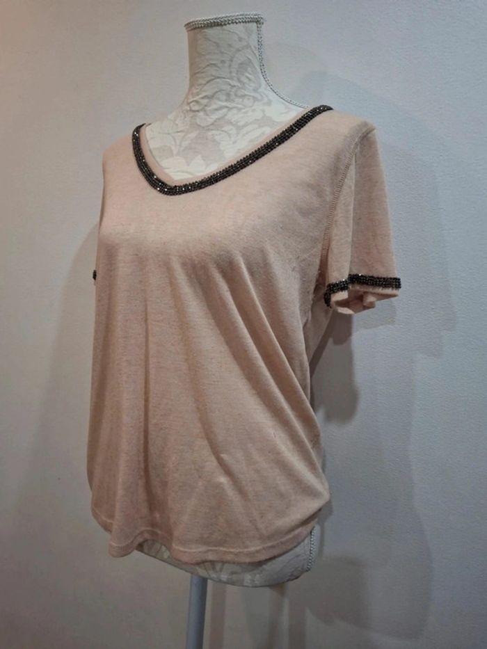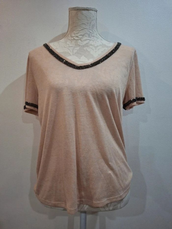 Tee shirt beige rose poudre strass brillants gris H&M taille S 36