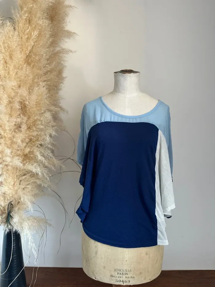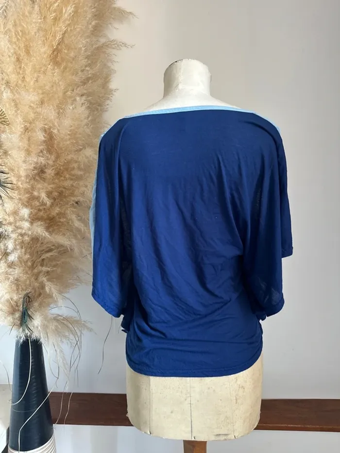 Joli haut fluide à manches courtes Manches chauve souris Bleu et blanc Taille XS Très bon état