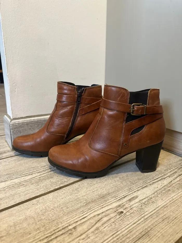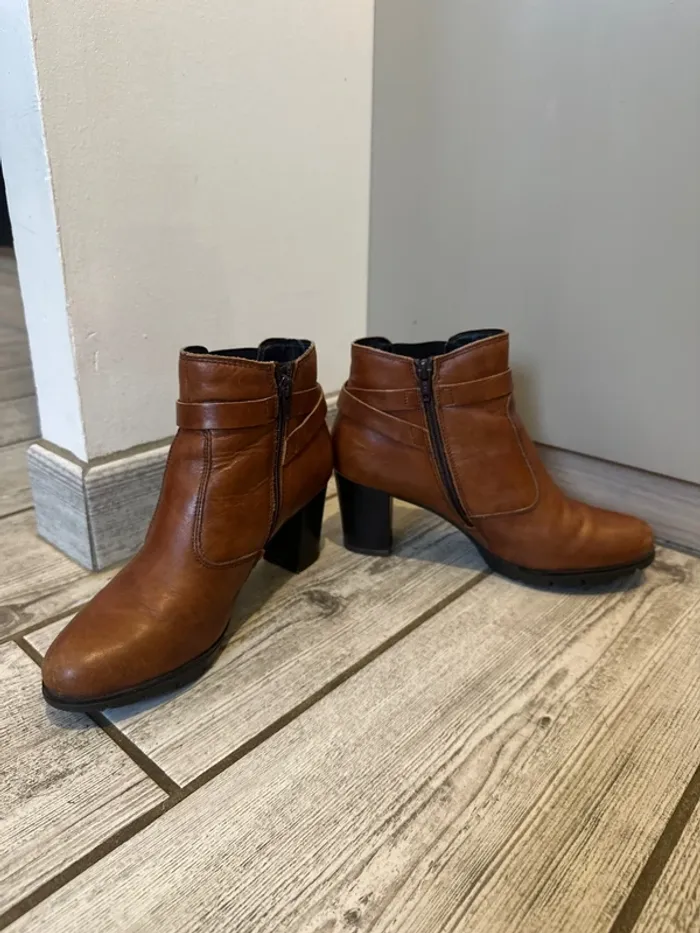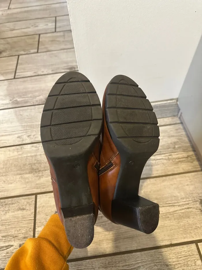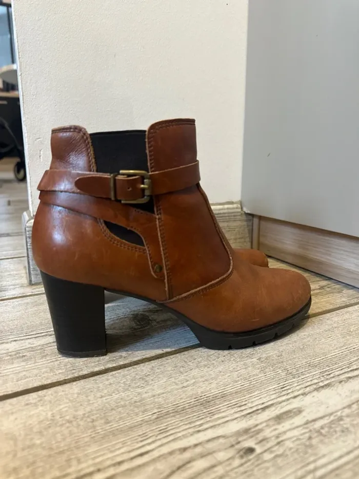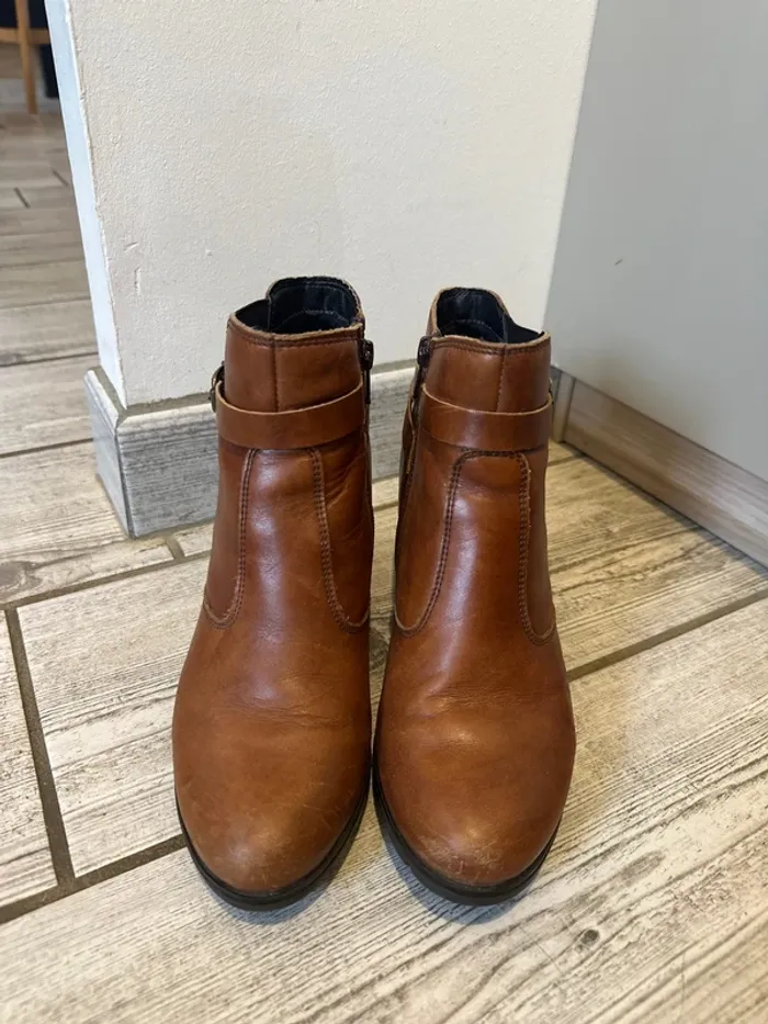 Jolies petits bottines en cuir véritable 100% (intérieur, extérieur) Couleur camel Se ferment avec une fermeture Très peu portées Très bon état général Quelques très légères traces ici et là mais qui se voient très peu, tout est visible sur les photos ☺️ Achetées 69€ chez Gemo